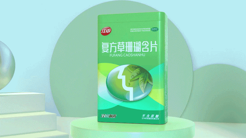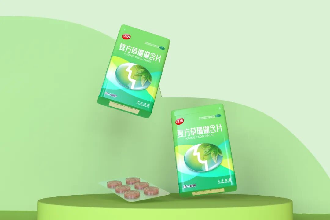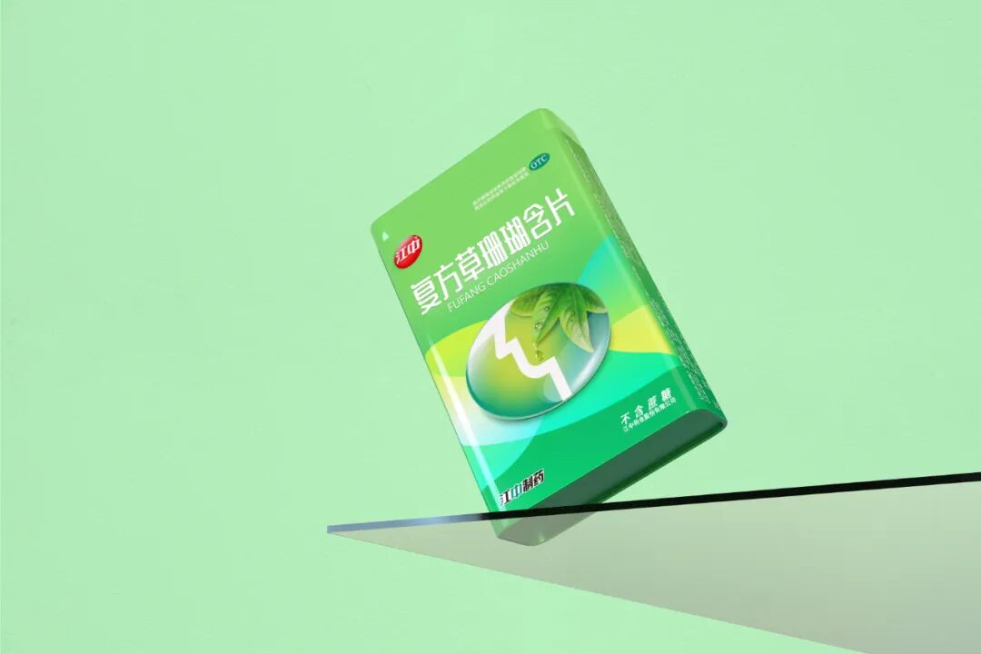 首先,我们保留了经典包装中的标志性椭圆符号,在此基础上,用矢量图形的形式,将草珊瑚叶片嵌入其中,并将叶片的精华水滴下落的位置对准了咽喉的部位,表达产品成分源于自然的特性。