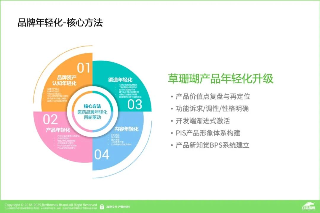 通过红马方法-医药品牌年轻化的四轮驱动,进而对草珊瑚产品进行年轻化升级,对其产品的价值点复盘与再定位、受众对产品的功能诉求、确定新品牌调性、开发端的渐进式激活以及产品新的PIS系统的建立等展开工作。