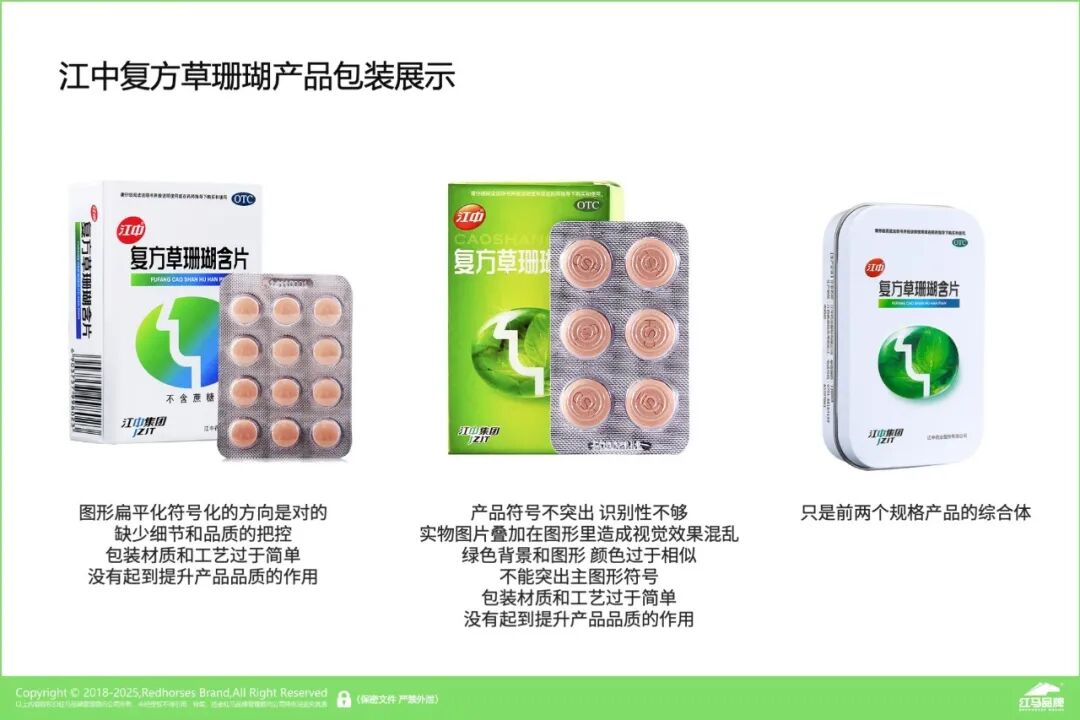 通过产品包装的罗列及观察,以及结合红马对草珊瑚产品的策略分析,不同规格的包装在外观上都存在一些问题: