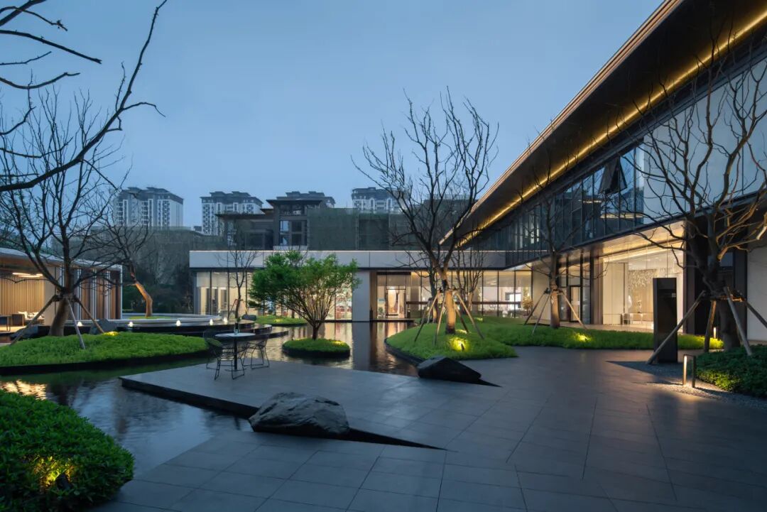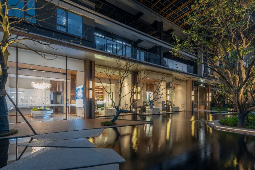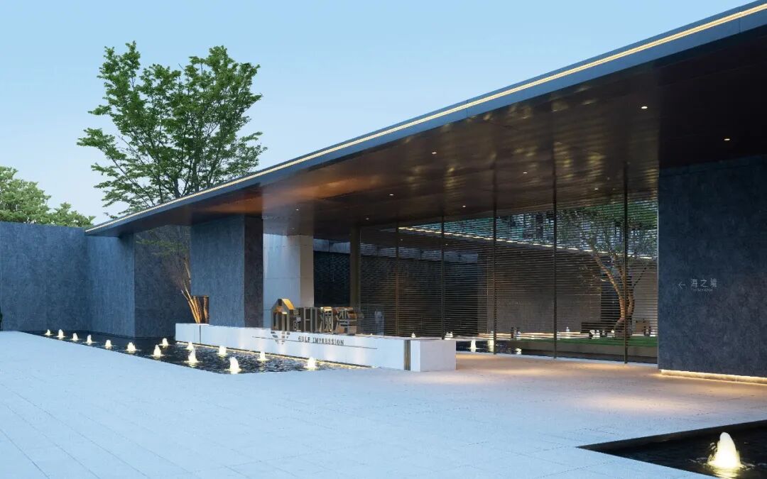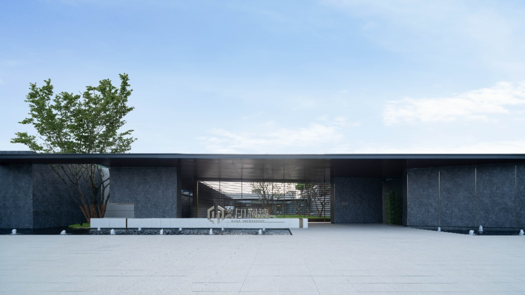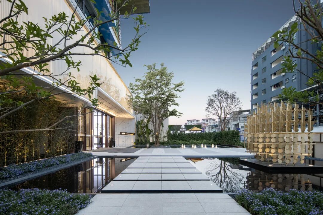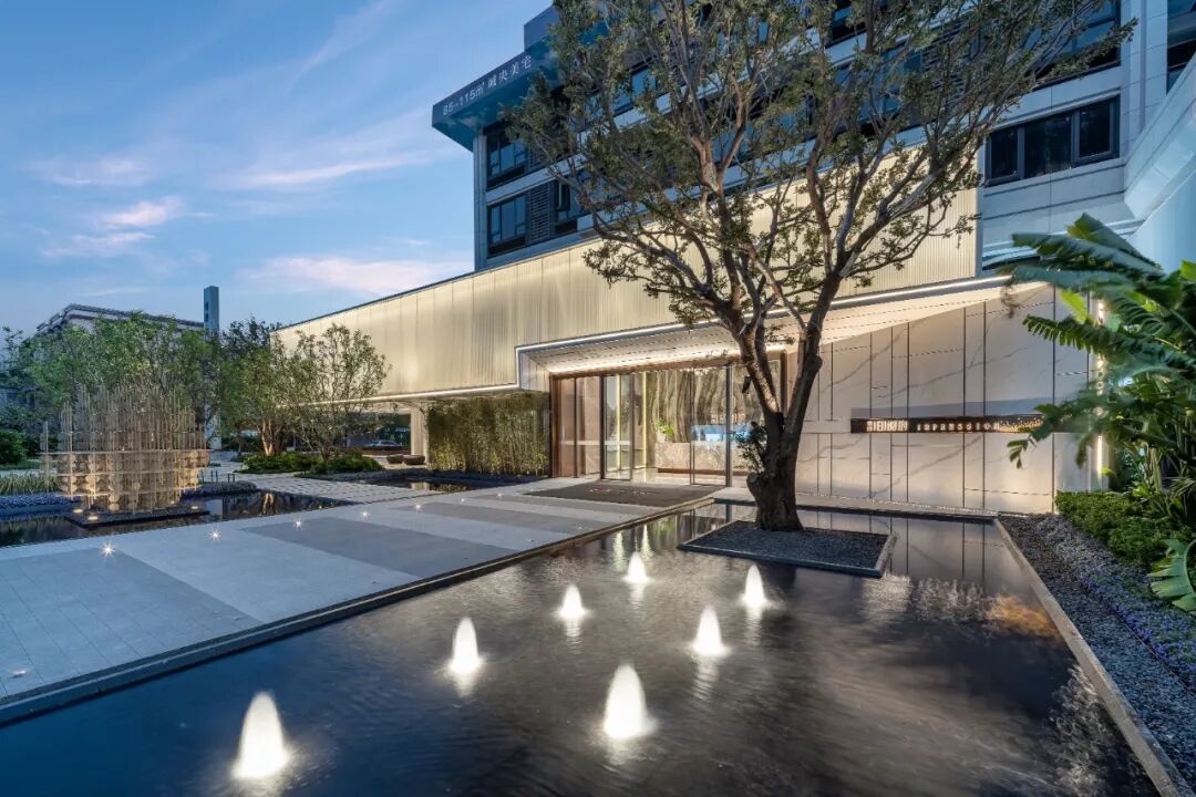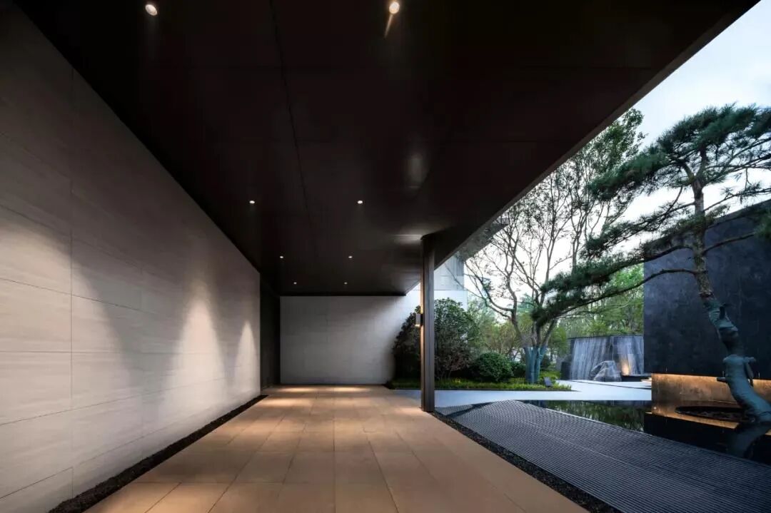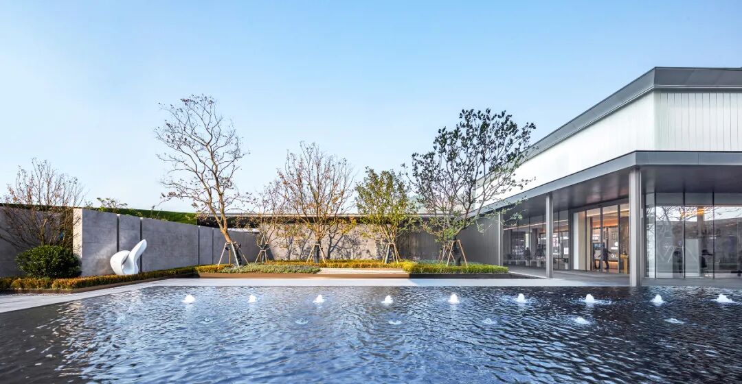 门头及内场立面由高冷转向温馨,给业主所见即所得的归家感受。景观设计上传承尊贵的仪式感与未来相连,以水线贯穿场地前后,诠释四会因水而兴的历史。前场的镜状水院映射天地,营造广阔与静谧的空间感,艺术雕塑在不经意间点亮了空间的时尚气息;后场则趋向活泼,利用大量绿植、多层次的水景,采用自然的手法,实现不同空间感受的切换。