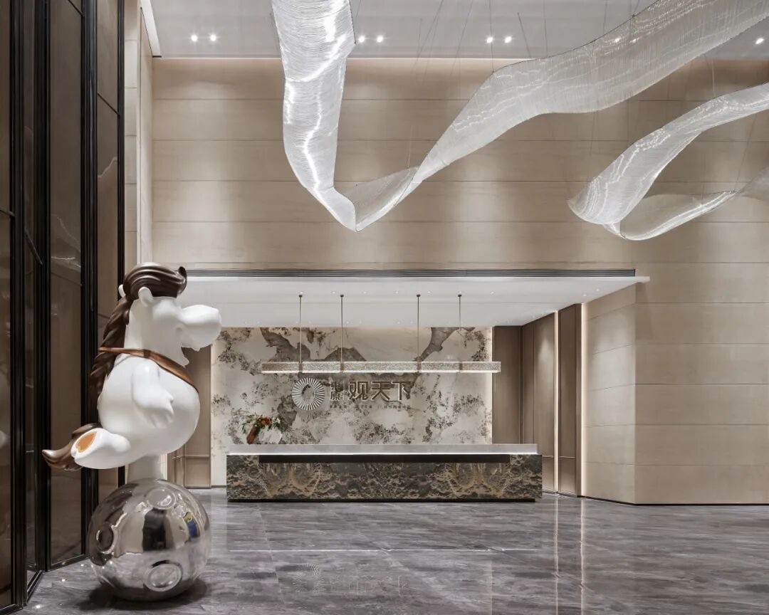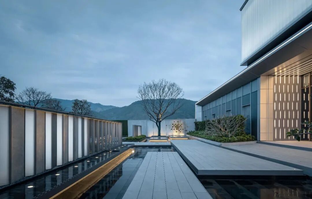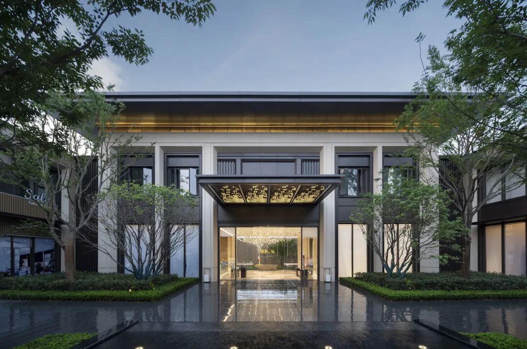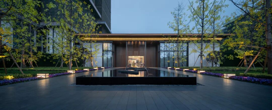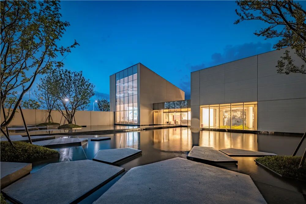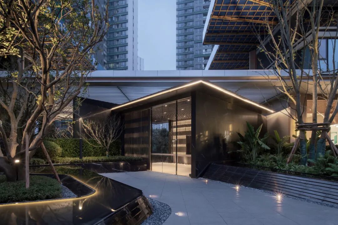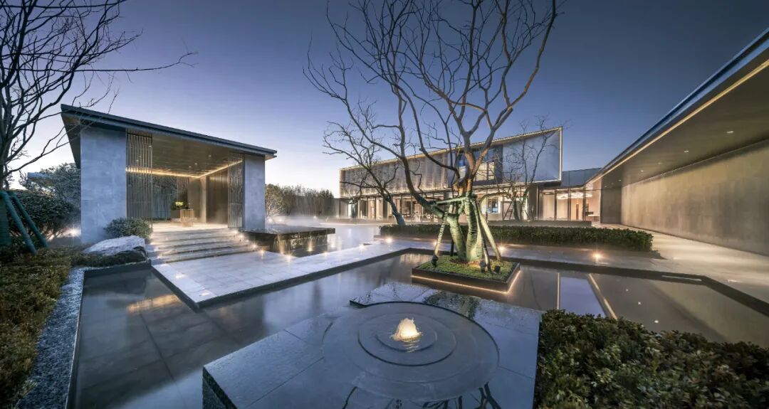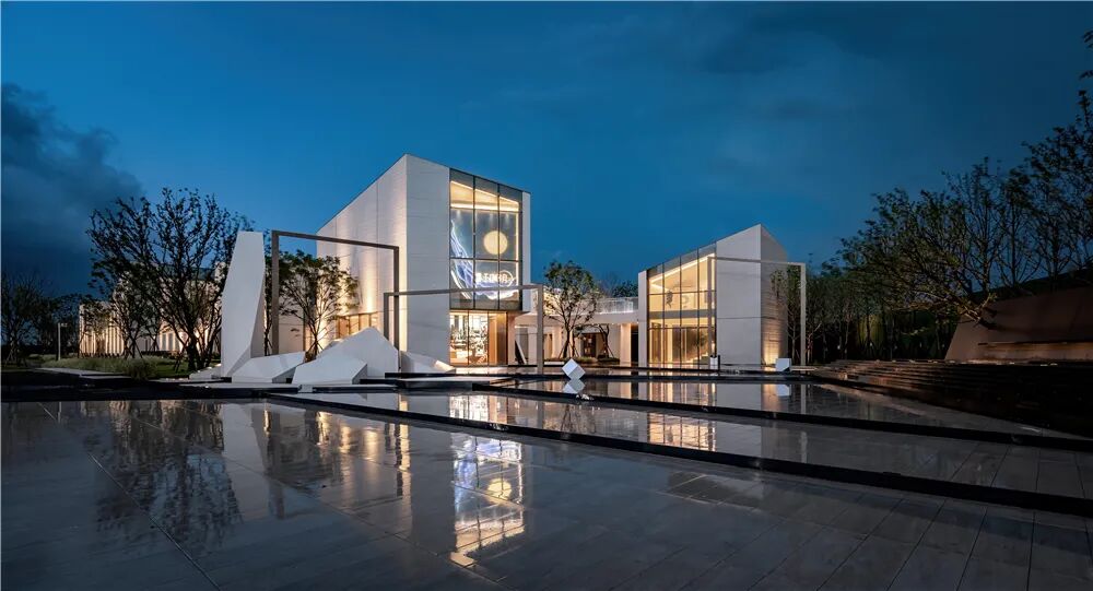 门头及内场立面由高冷转向温馨,给业主所见即所得的归家感受。景观设计上传承尊贵的仪式感与未来相连,以水线贯穿场地前后,诠释四会因水而兴的历史。前场的镜状水院映射天地,营造广阔与静谧的空间感,艺术雕塑在不经意间点亮了空间的时尚气息;后场则趋向活泼,利用大量绿植、多层次的水景,采用自然的手法,实现不同空间感受的切换。