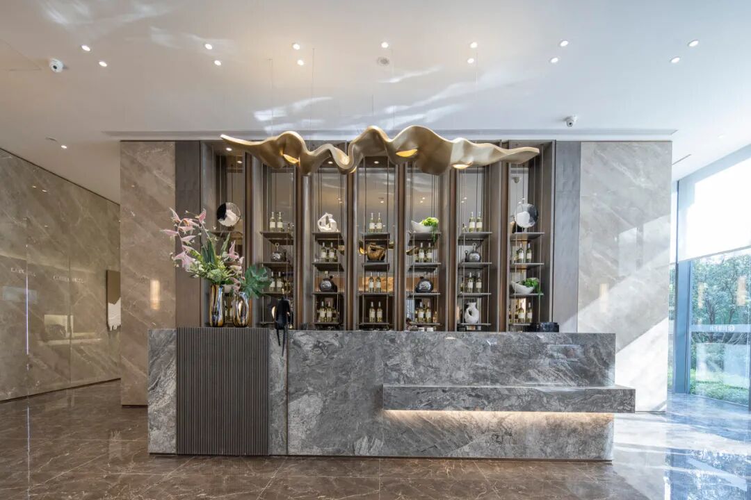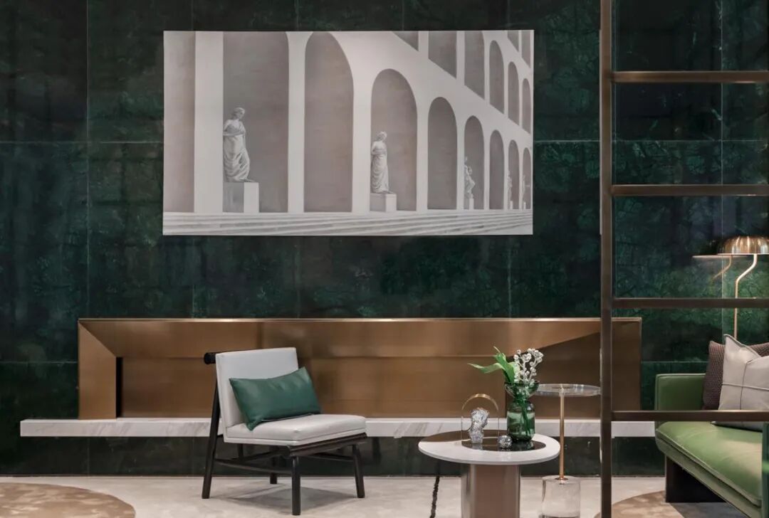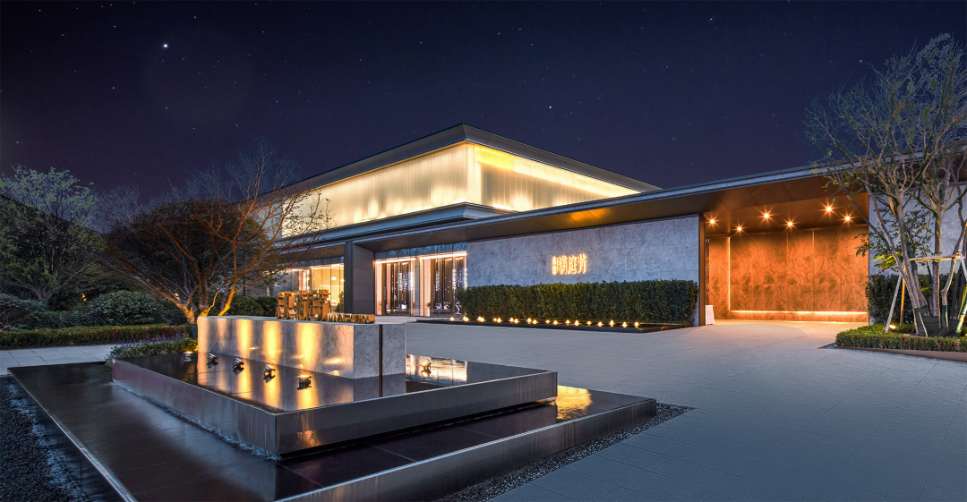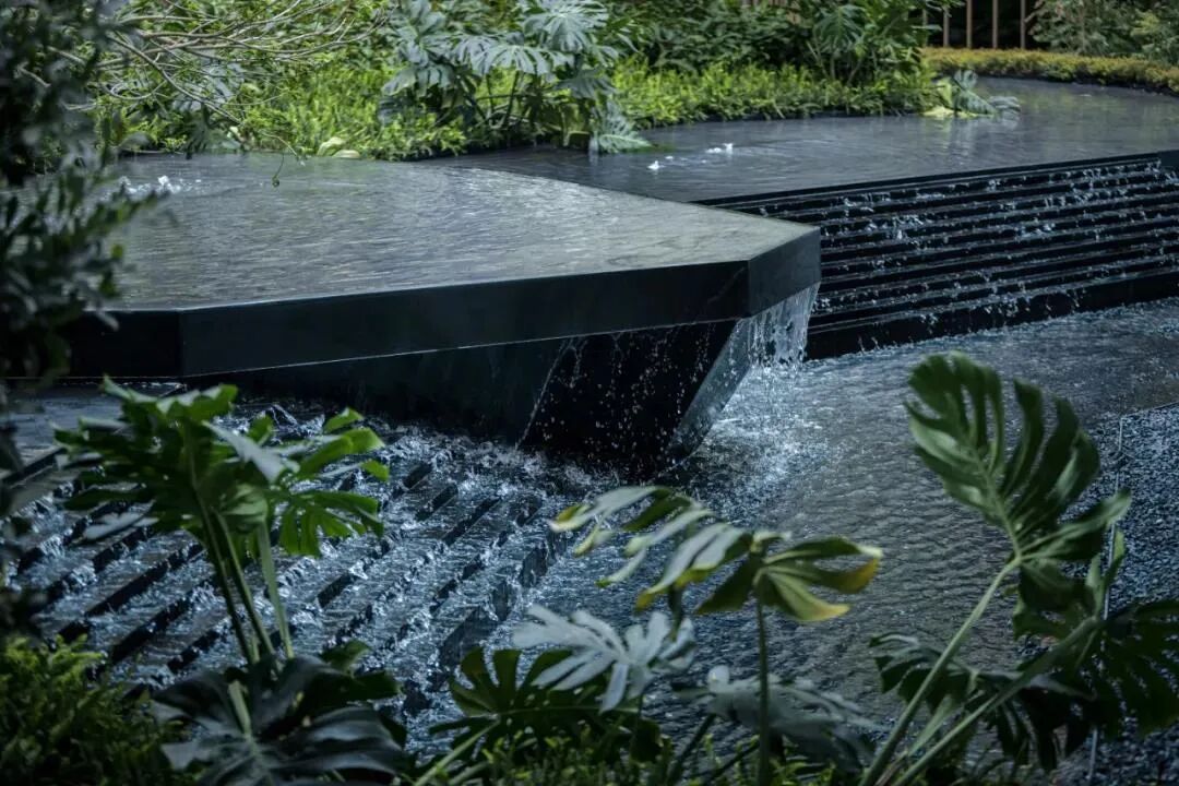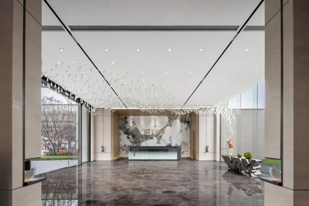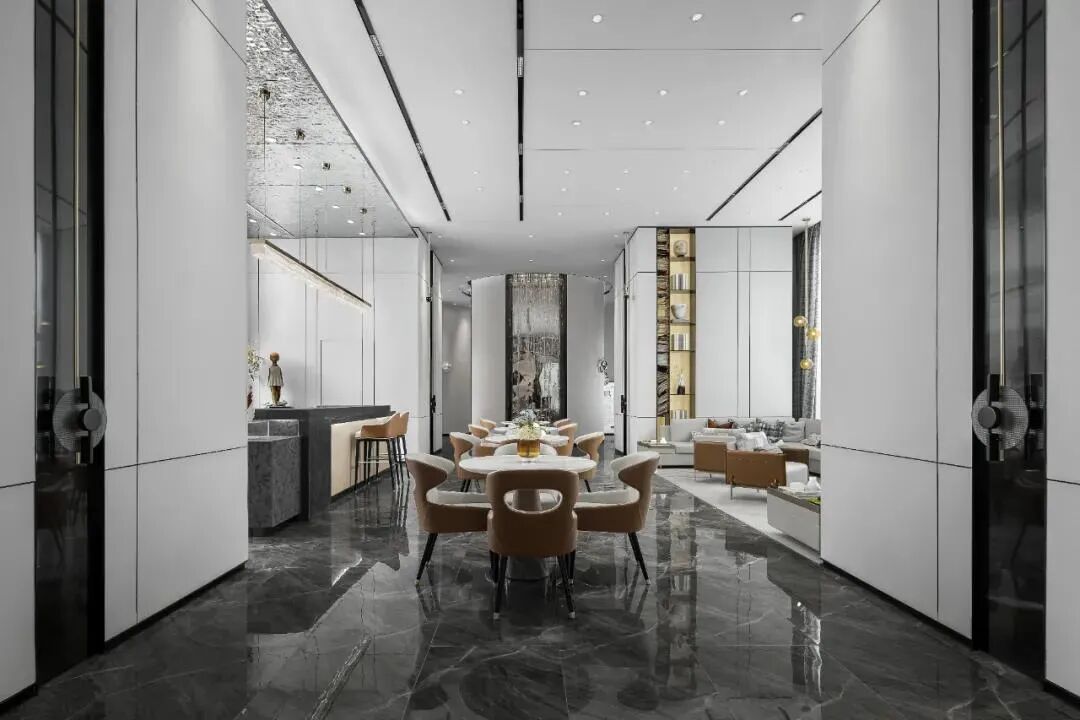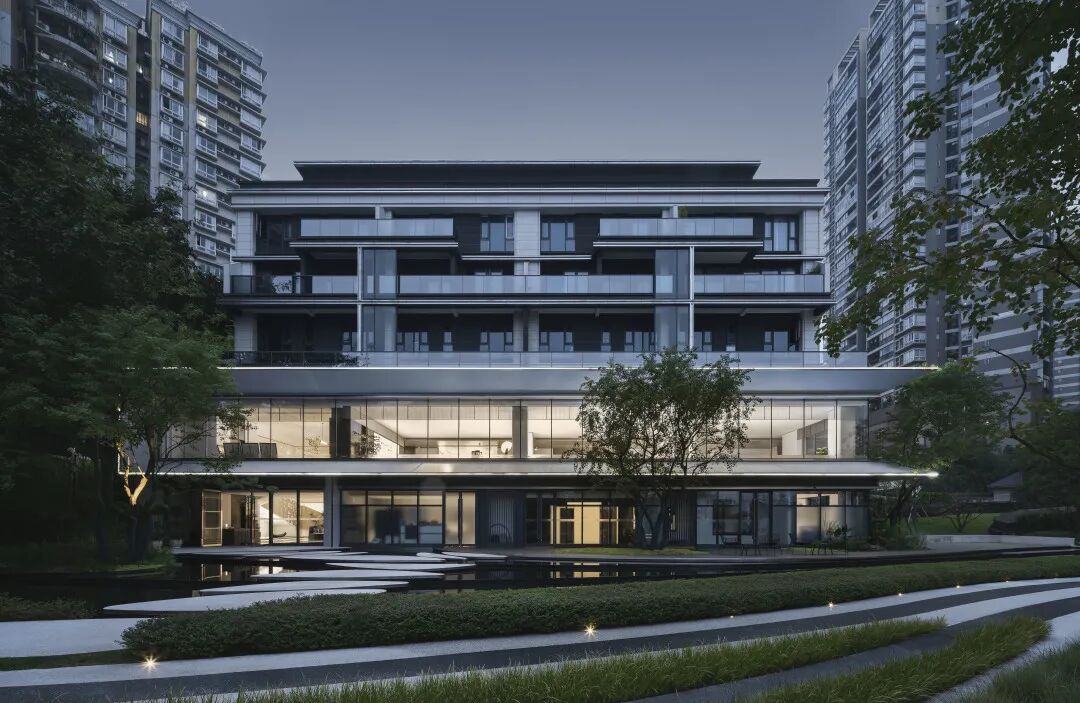 门头及内场立面由高冷转向温馨,给业主所见即所得的归家感受。景观设计上传承尊贵的仪式感与未来相连,以水线贯穿场地前后,诠释四会因水而兴的历史。前场的镜状水院映射天地,营造广阔与静谧的空间感,艺术雕塑在不经意间点亮了空间的时尚气息;后场则趋向活泼,利用大量绿植、多层次的水景,采用自然的手法,实现不同空间感受的切换。
