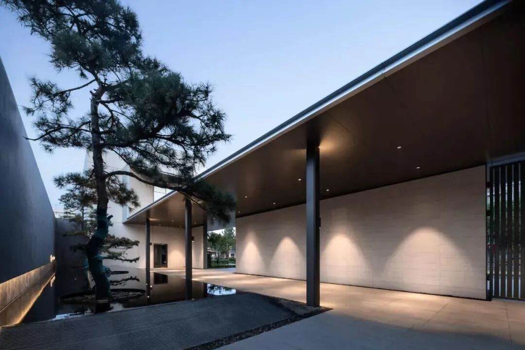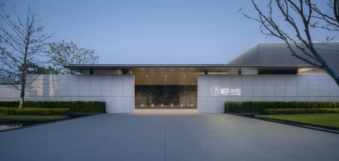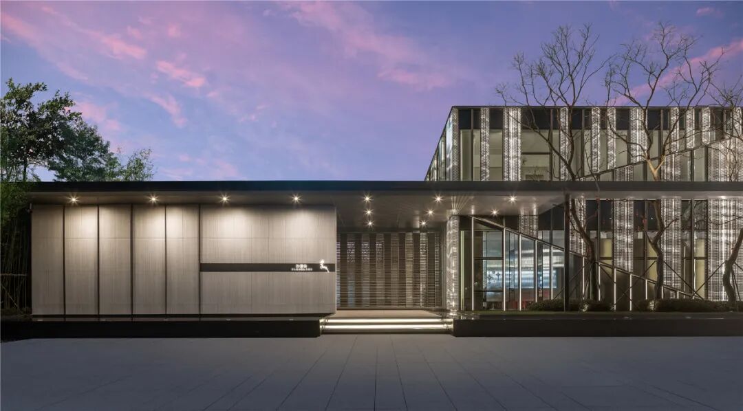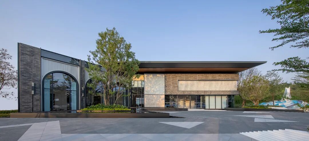 入口极简的线性树阵与景墙作为面向城市的形象展示界面,景观廊架与建筑幕墙穿孔铝板的材质形成鲜明对比,与水景相映交汇增强参观体验,景观与建筑的体块穿插让丰富了空间感受的渗透融合。