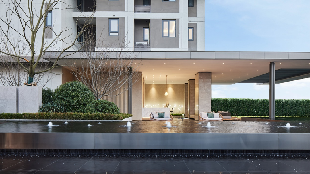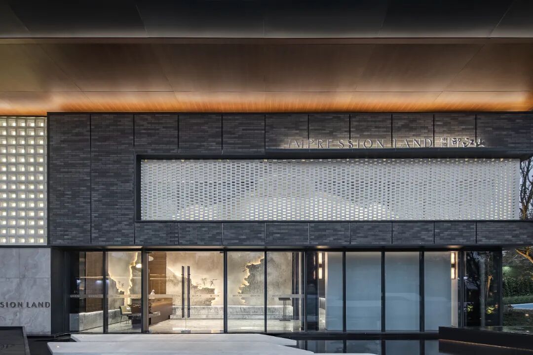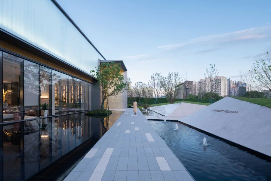示范区入口的格栅形态,从新津独特的水文化中提炼出自然元素中的设计语言,实现景观、建筑、精装三者之间的逻辑统一,再结合有纵深感的方形墨池,不仅呼应了新津的在地文化,还弱化了长界面的单调感,使整个城市界面虚实兼备,强弱层次分明。
