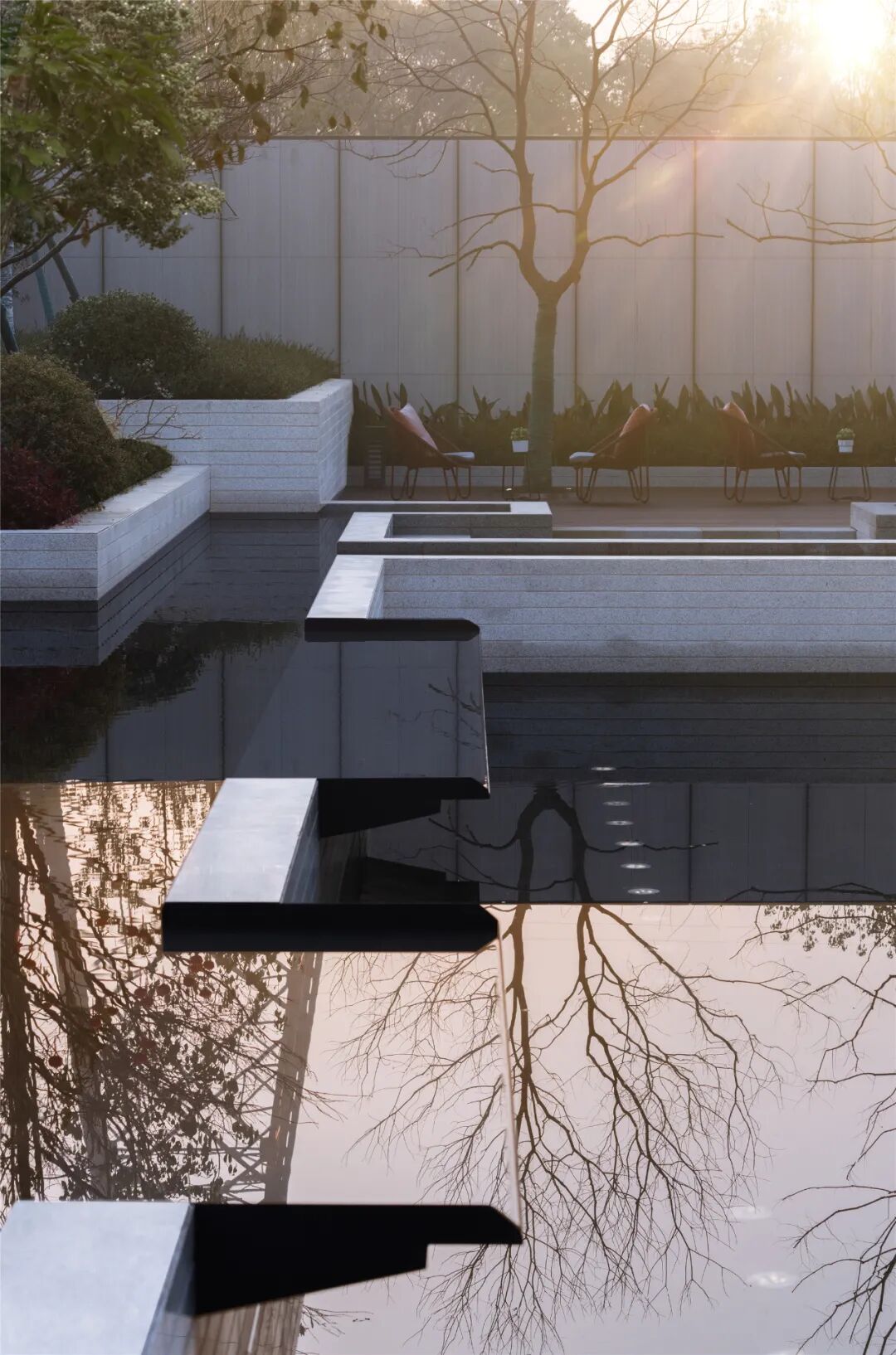 廊、柱、水——形成经典的游憩空间,通透的玻璃幕墙,模糊了室内外界限,置身室内,宛若水中;每一处景观小品,既能独立成景,又能完美的融入整个空间。水面串联起光之谷、廊道、平台、建筑,微风拂过,水面泛起层层涟漪,憩于平台之上,观疏影横斜,竟有些分不清现实与虚幻的界限。