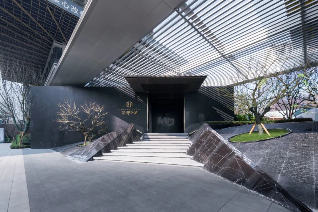 东原印江滨选址于重庆南坪核心区——铜元局,项目通过设计本身,巧妙的将主入口,架空层与城市界面进行了高度的有机融合,在两栋塔楼之间形成宽26米,高度近10米的银灰色金属连廊,现代简约而极具力量感,形成高门大院的空间感受;塔楼架空层的景观设计与主入口融为一体,在空间上最大限度的拓展了主入口的尺度,黑色石材的斜墙,斜切的台阶和灵动的斜面流水板,在狭小的场地内形成大气且独特的归家仪式。