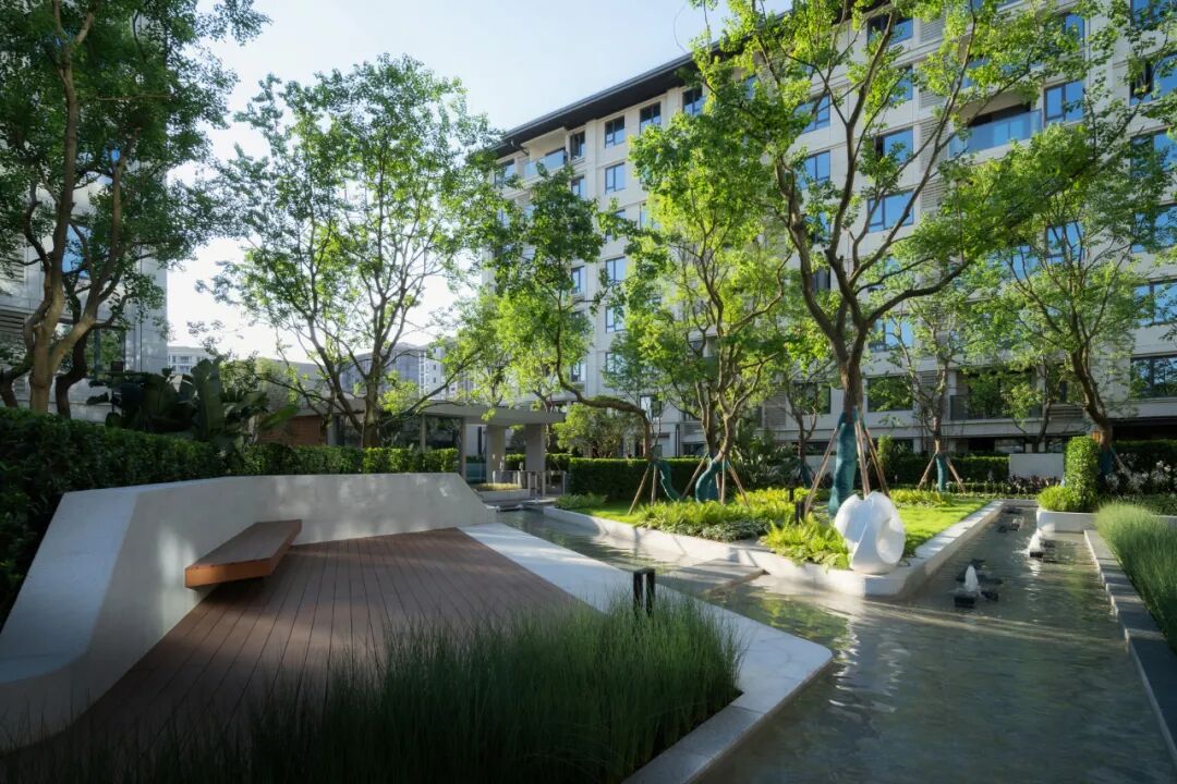 围合式布局打破景观组团均质化,释放楼栋间距,营造出极为稀缺的中庭空间尺度,同时给到景观更多的余地,从绿化到水景,实现让业主伴水而居的宅度假生活场景。运用纯粹朴实的线条勾勒出人们所追寻的现代生活,将山水人文融于现代生活体验之中,在场地中寻求一份悠闲自然的心境。