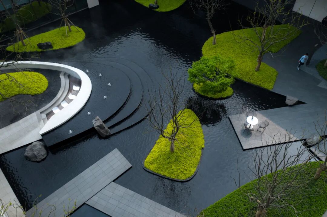 空间以曲水万象之镜,建立城市与自然的链接,以天为裳,化形为韵。艺术感的造型及布局,为空间增添了现代感,提升和引领当地居民对生活品质的追求。