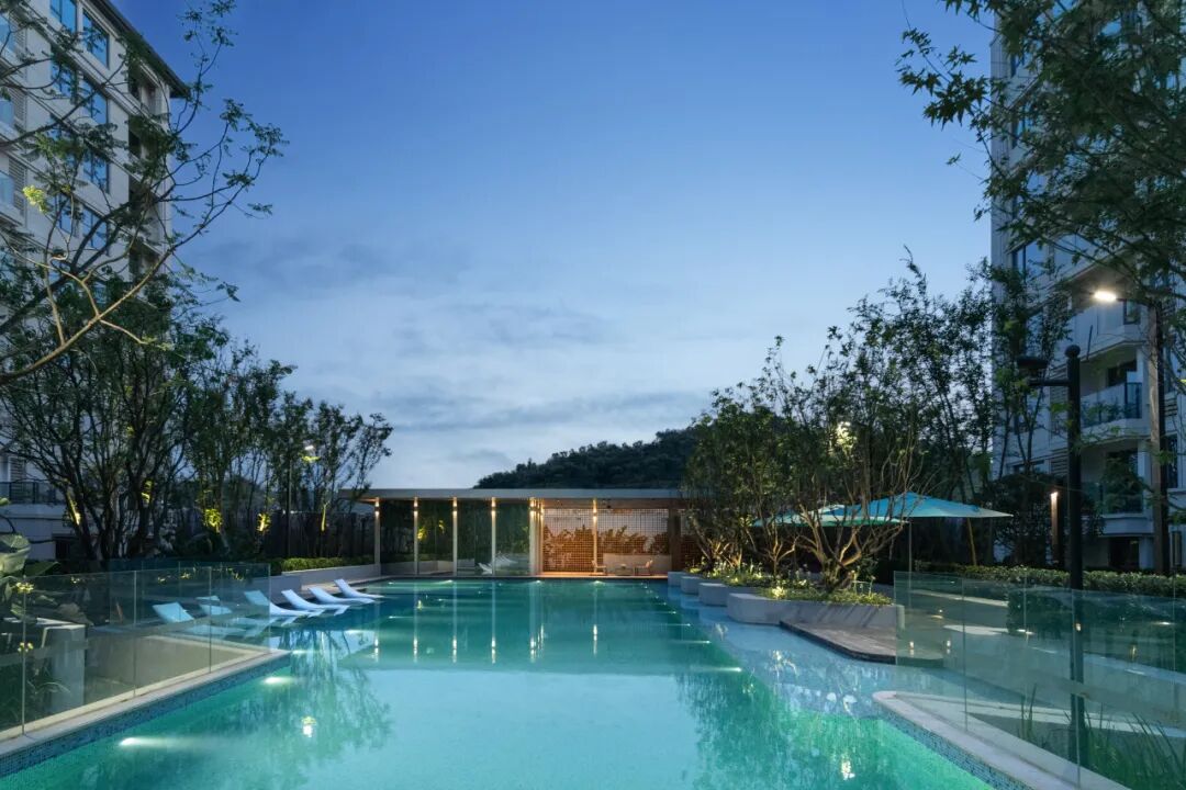 项目以度假型景观为主导价值,强调以绿色、智慧、生态、交互的都市化设计理念为设计宗旨,更是引入了轻度假式生活体验。用轻松折线的空间结构、多重礼仪式归家动线、舒适体量的核心类泳池、高端精致的度假景观元素,定义了新一代的城市居住体验,让人们从一整天的喧嚣中回到家,能找到心灵的宁静,与家人享受度假般的舒适。