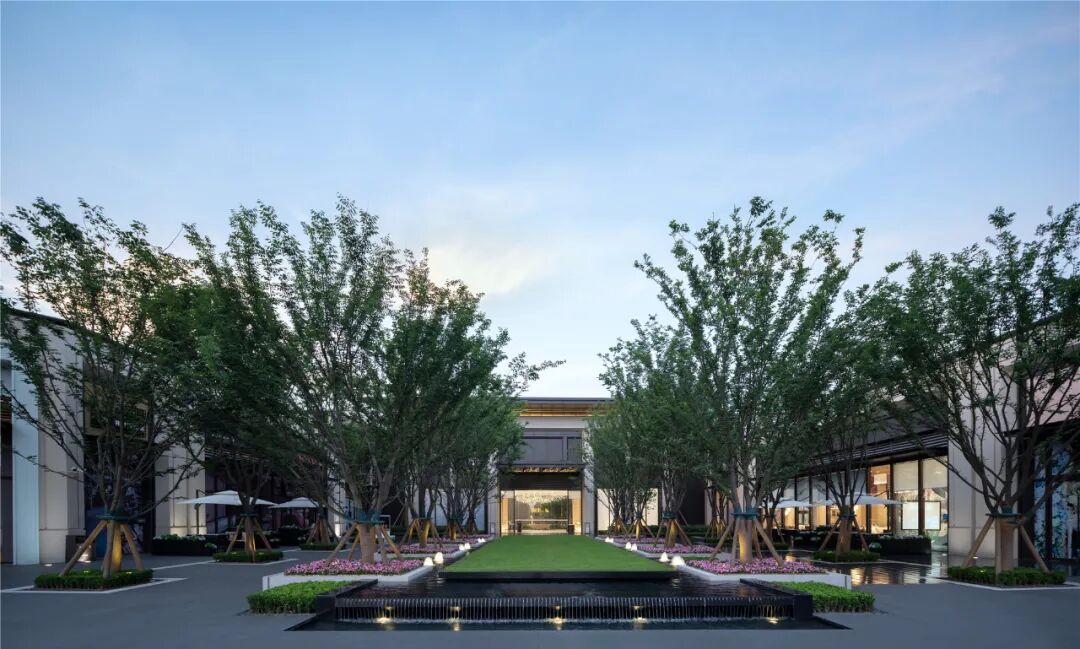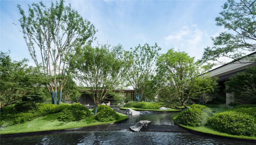 项目结合场地精神、度假生活以及艺术美学进行景观打造,引入自然概念,模拟自然场景。将意向经过演变让其实现场景化,从访客的体验感出发,诠释当代生活方式,分别结合“林荫下、水云歌、树之庭”的语言特点作为地块的名片标识,将其融入地块景观,在润物细无声中,将内敛与含蓄写入空间。