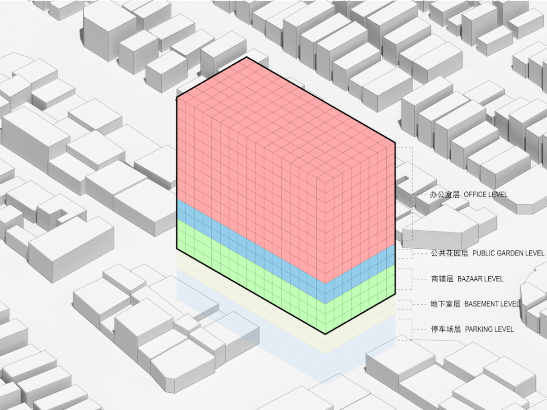 作为一个商业综合体,既要满足商业街的功能也要有足够的办公空间,设计师按照常理,大空间放下面,办公空间放上面