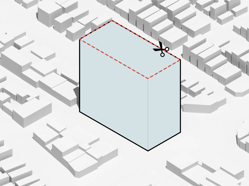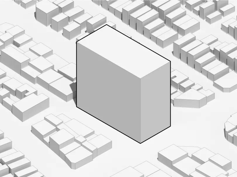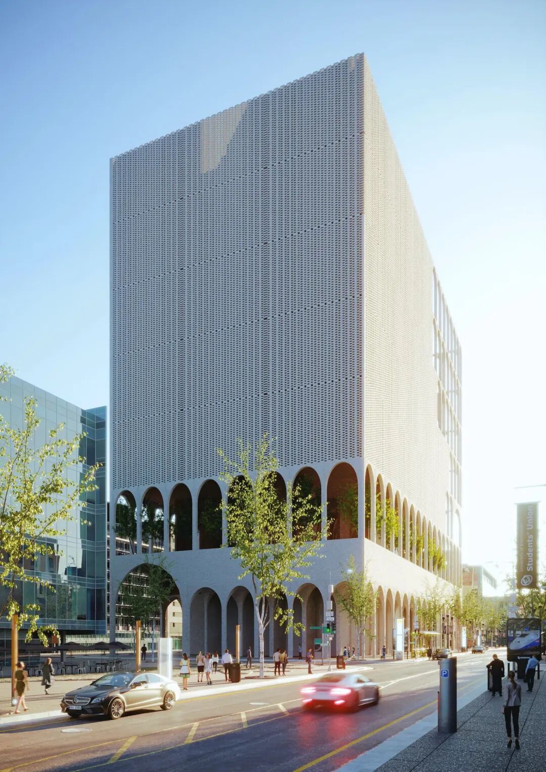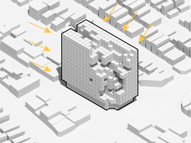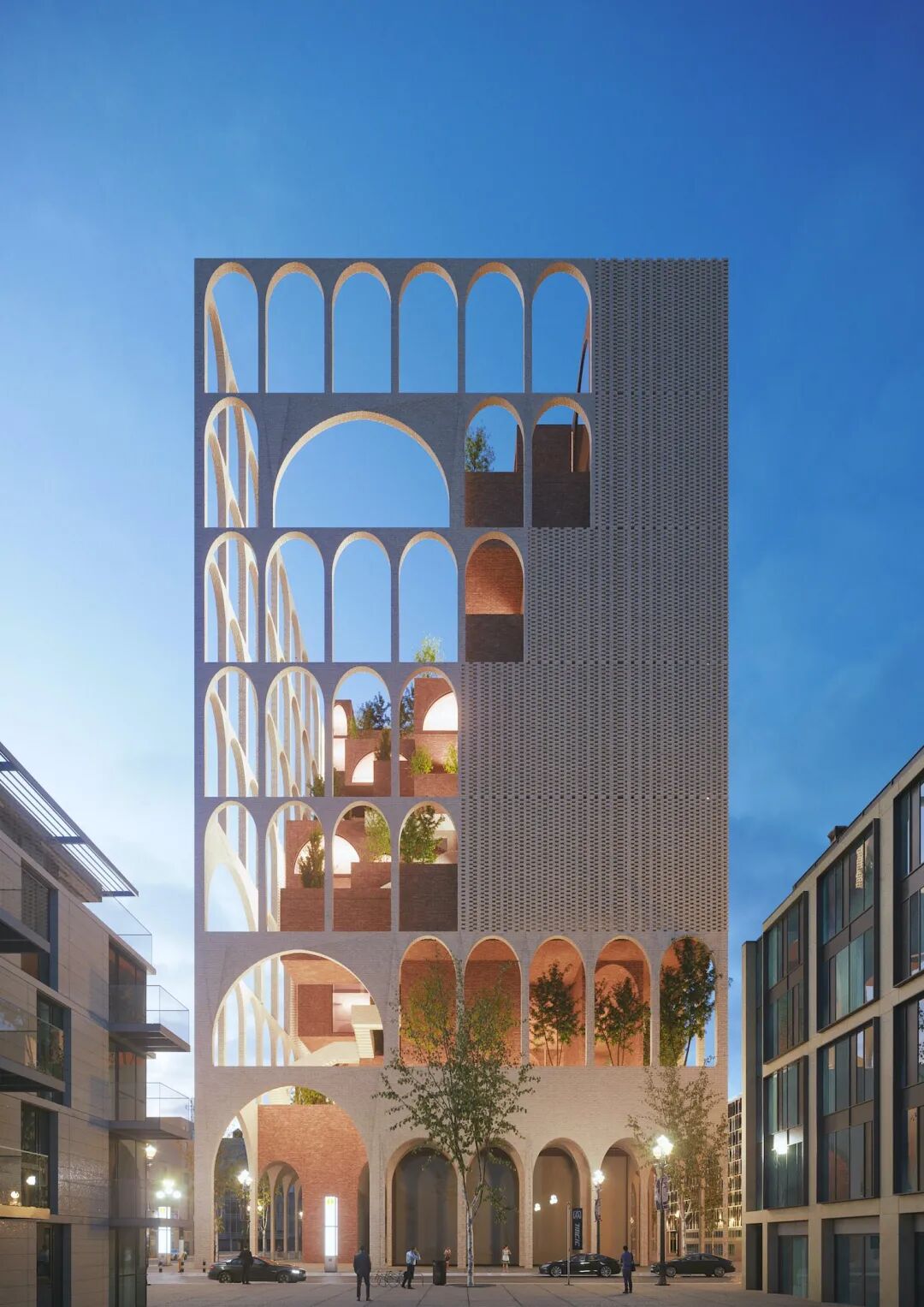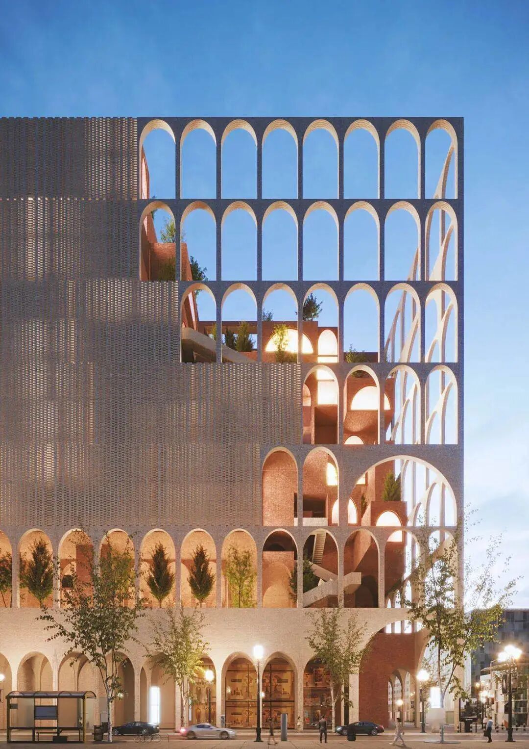 通过置入形态各异的拱形开口,打破了重复单调的城市画框,使人们通过过一个个开口可以看到不一样的城市画作。