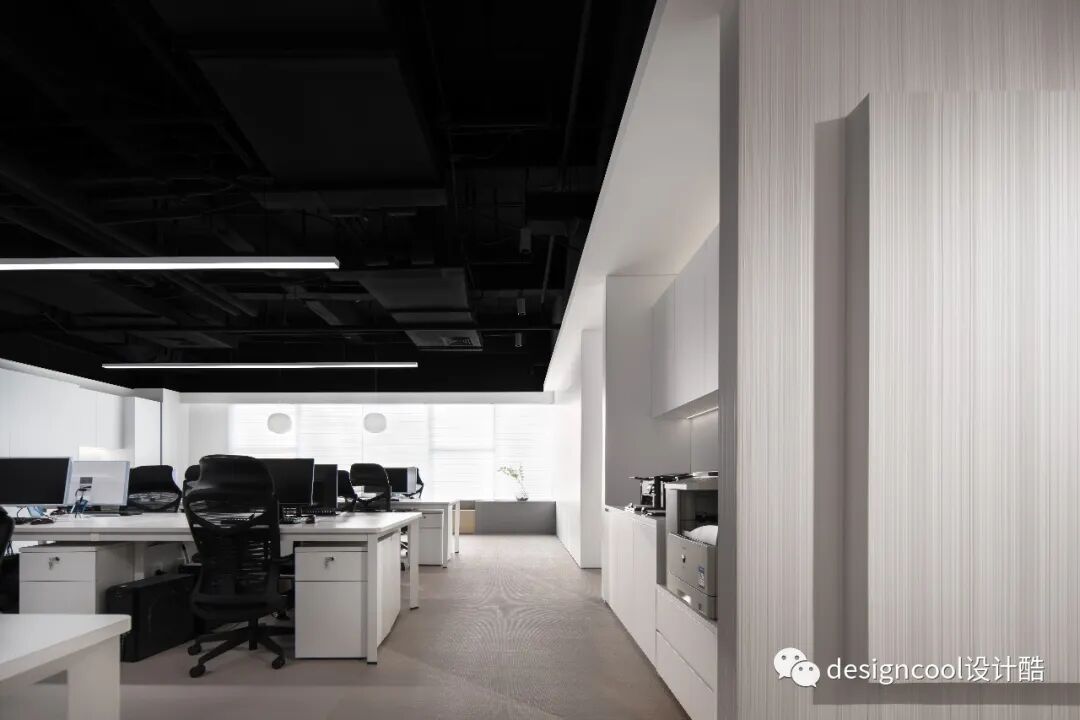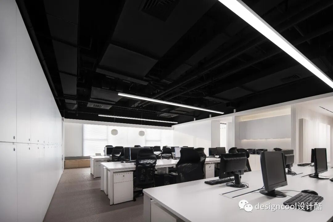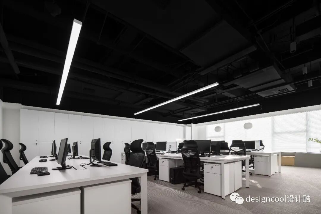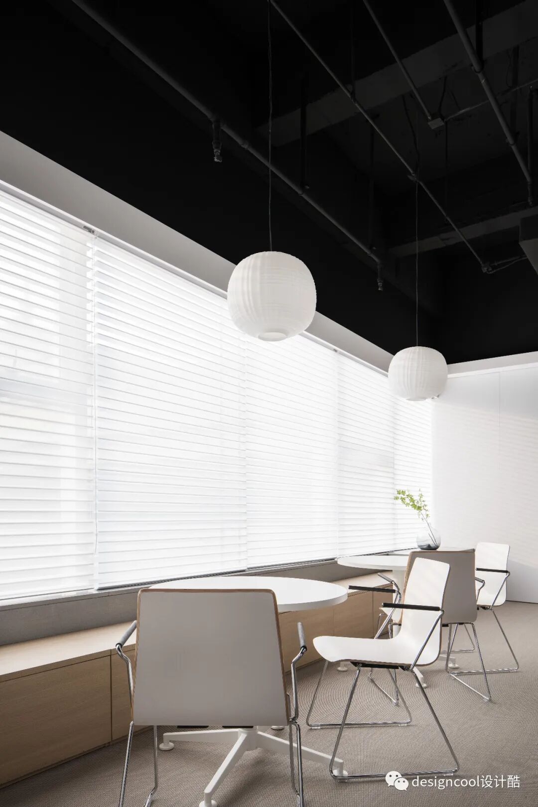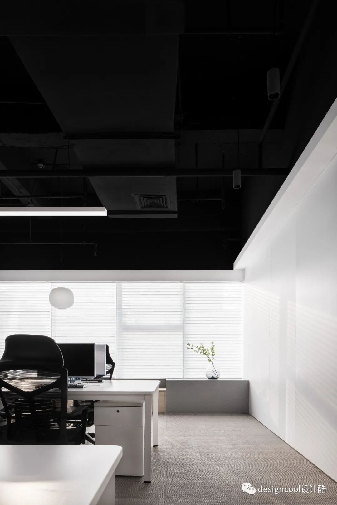 在开放式的办公环境里,黑与白的对立,尤为明显。黑色象征着内敛、冷静、果断,在这里,确保高效运行的办公环境。光的过渡,亦指向了从外到内到探索,从被动到主动的转变。