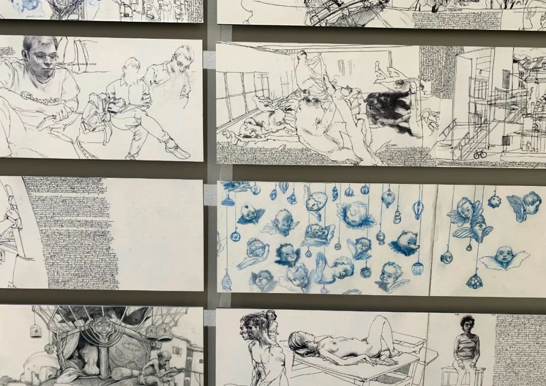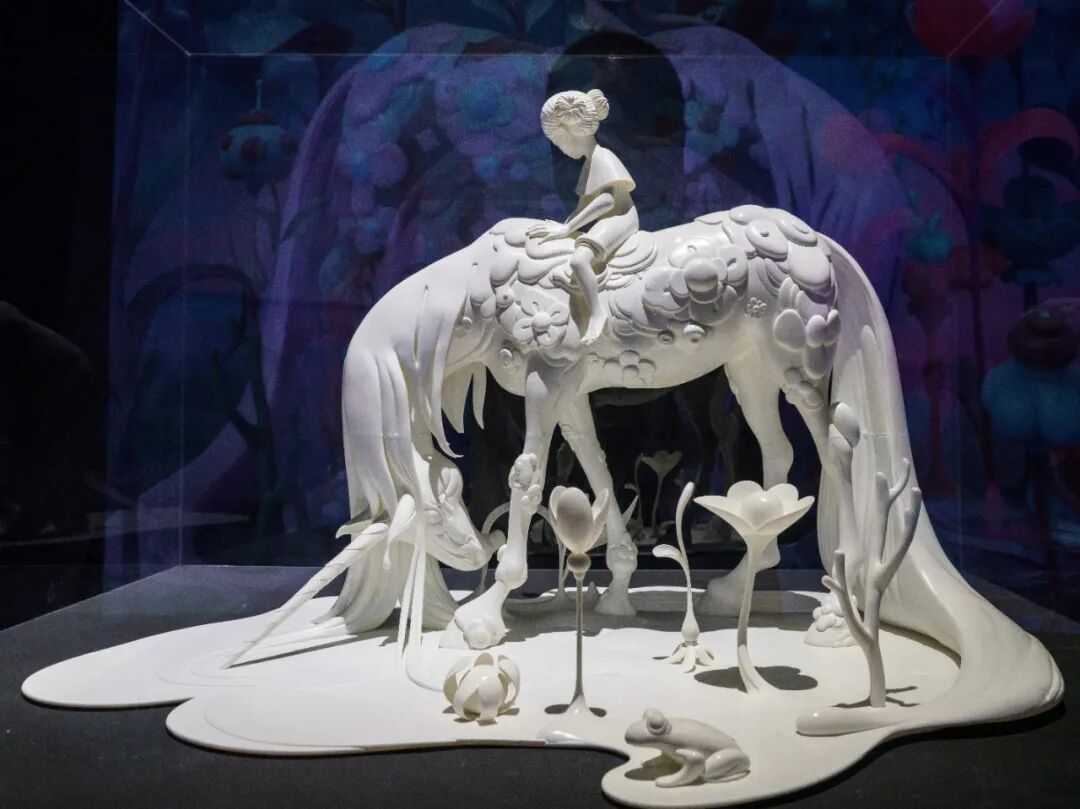 本次展览展出 简明 200余件个性鲜明的作品,深度呈现艺术家二十余年艺术生涯中的创作与思考,包括大型绘画、雕塑、动画、版画、手稿以及色彩研究、热门电影《瞬息全宇宙》、《水形物语》海报,以及多件来自世纪之初,极为罕见的艺术家速写本等。其作品主题与艺仓美术馆独具特色的旋转楼梯相得益彰,别有妙趣。