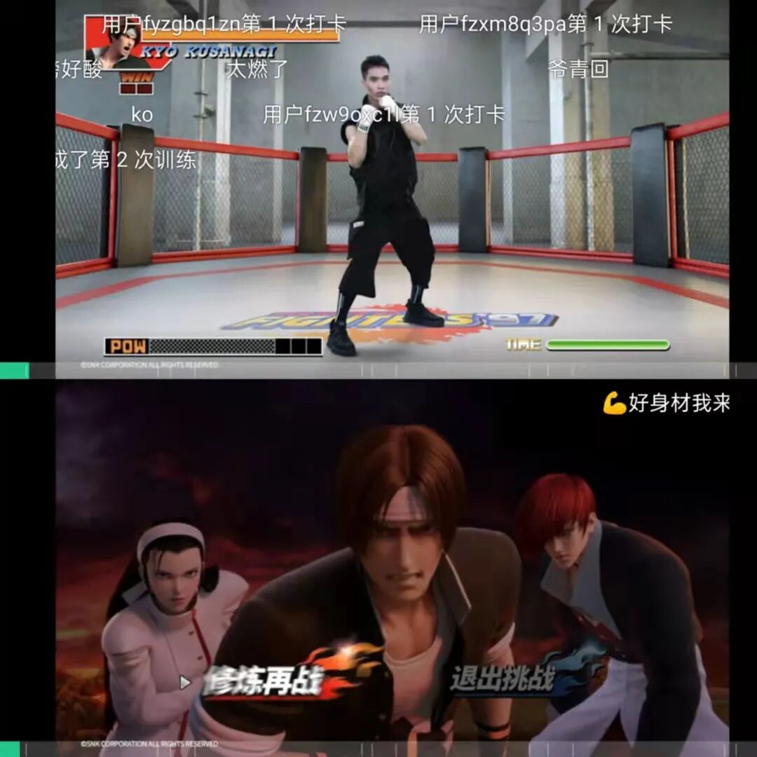 在拳皇课程中,开场情节设置在1997年KOF大赛,黑暗力量复活大蛇的阴谋败露,三神器传人与其展开毁天灭地的战斗。用户在真人教练带领下开始左直拳等“修炼”环节,化身草薙京形象,以左右直拳连击等动作“对战”克里斯、夏尔美、七枷社。最终以草薙京开启封印的情节结束训练。