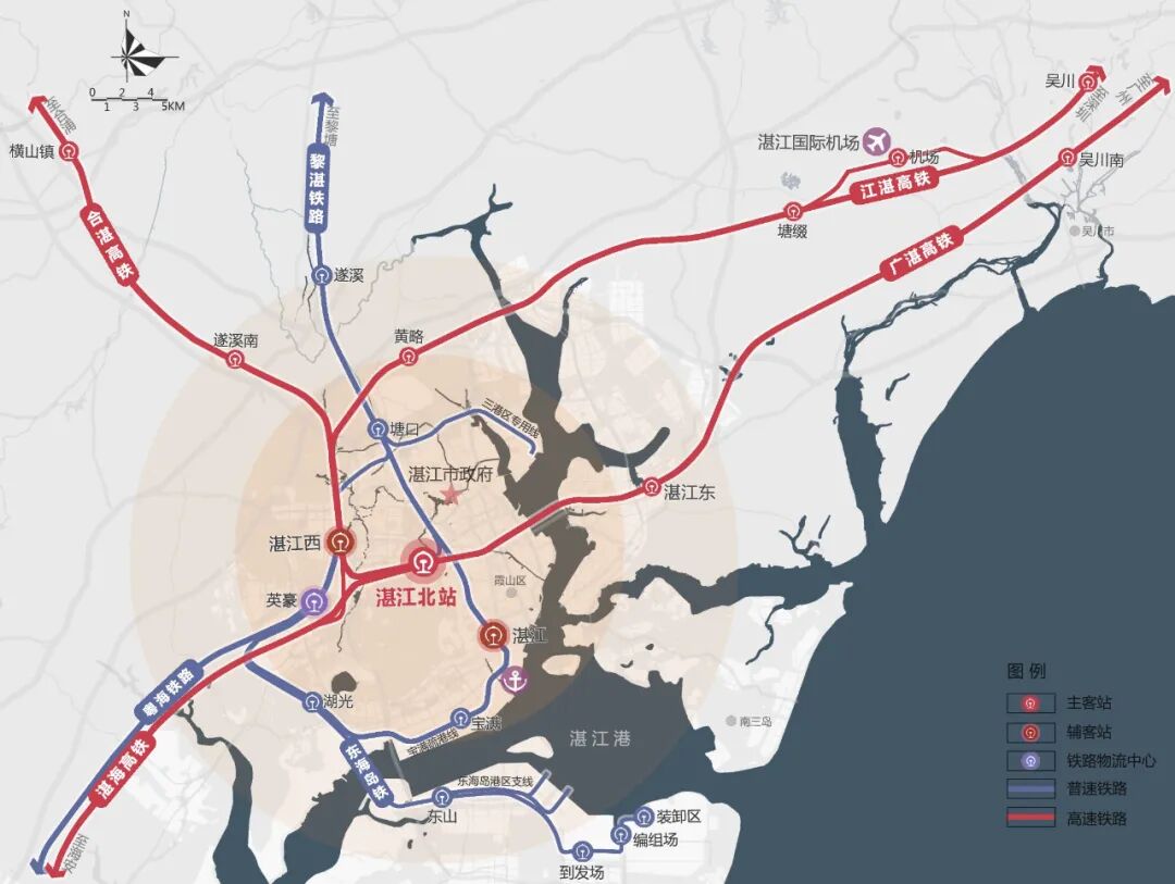 湛江市是粤西和北部湾中心城市,定位为广东省域副中心城市。湛江北站作为广湛高铁的新建始发站,“五龙入湛”的全国性综合交通枢纽,可直接连接粤港澳大湾区、北部湾经济区、海南自贸港等三大国家战略区,充分发挥湛江极点带动及关键串联作用。