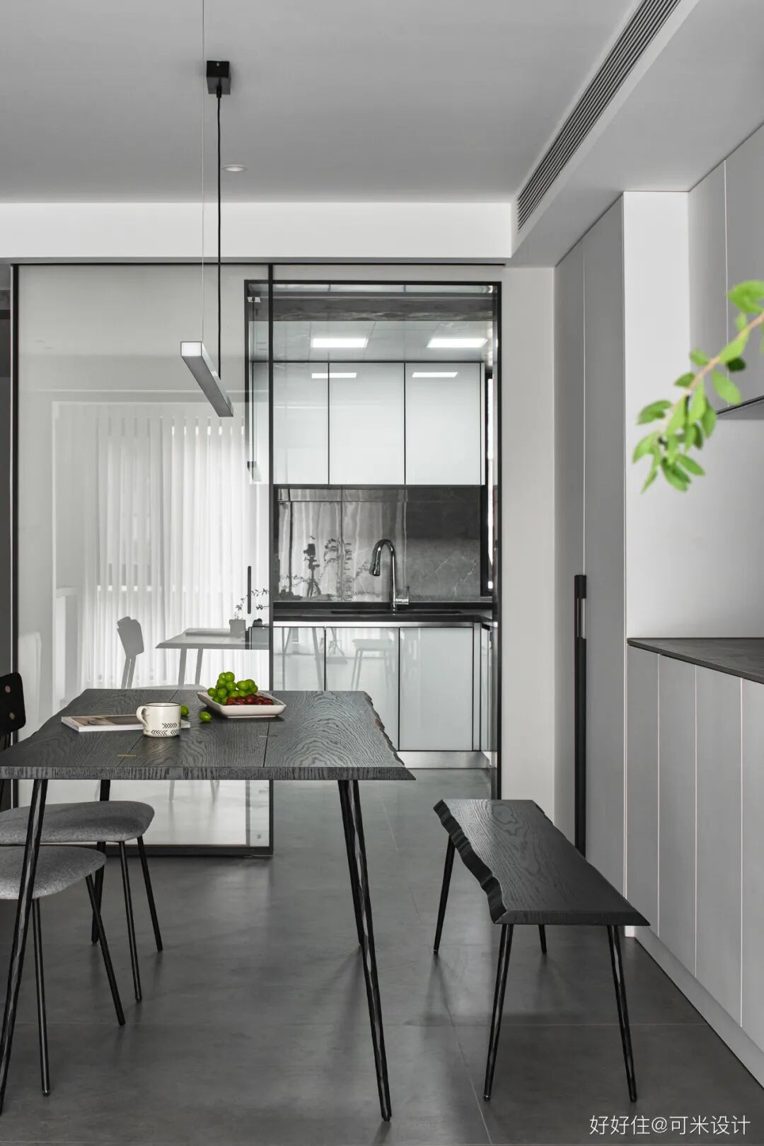 餐厅购置黑色的一字吊灯,简单的几何外形,给简约的空间增加了空间的层次美。长方形餐桌+2把餐椅+条凳的组合方式,将美感与实用完美结合,干净舒适的线条遇上高级黑,勾勒出简约的自然格调。