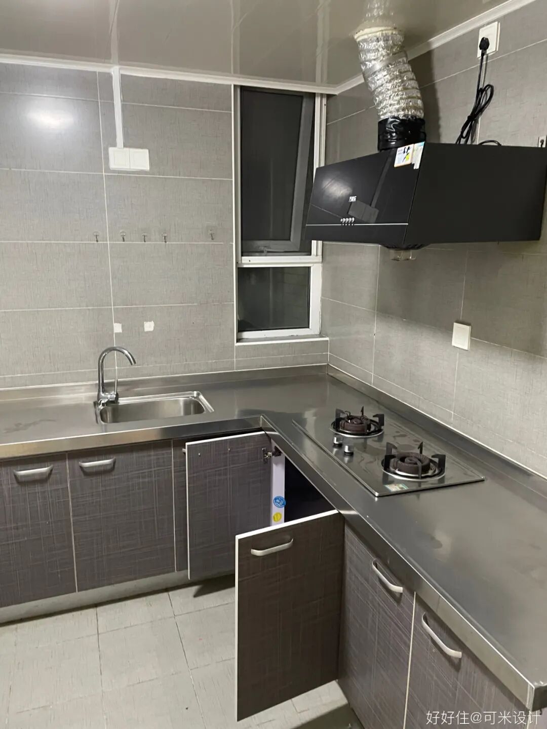 屋子之前是作为群租房使用的,厨房配置简单的L型橱柜,简易装修。