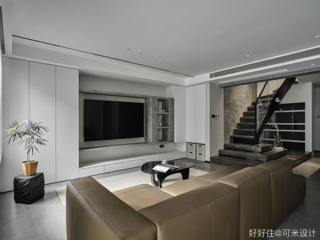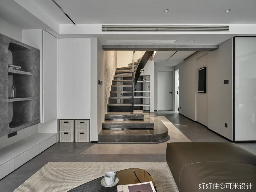 可米设计:从二楼俯视楼梯,灰色的石材踏步不仅提高了空间质感,搭配上玻璃护栏,也让楼梯摆脱了笨拙感变得轻盈。在灯光的映衬下,透出不一样的光感,层层叠叠,柔和温暖。
