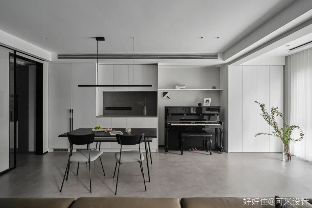 开放一体的客餐厅空间,统一连贯的装修风格与色调,给人一种视觉上的扩容效果,增加了空间的互动性。靠墙布置一架钢琴,不仅能在家中演奏优美的音乐,还能散发出一种特殊的文化气息,音乐响彻于屋内,在这开阔的空间之中,更有助于聆听。小巧的壁灯照亮钢琴区,上方设计一块搁板,可以放置书籍、饰品等,增加屋内的艺术气息。