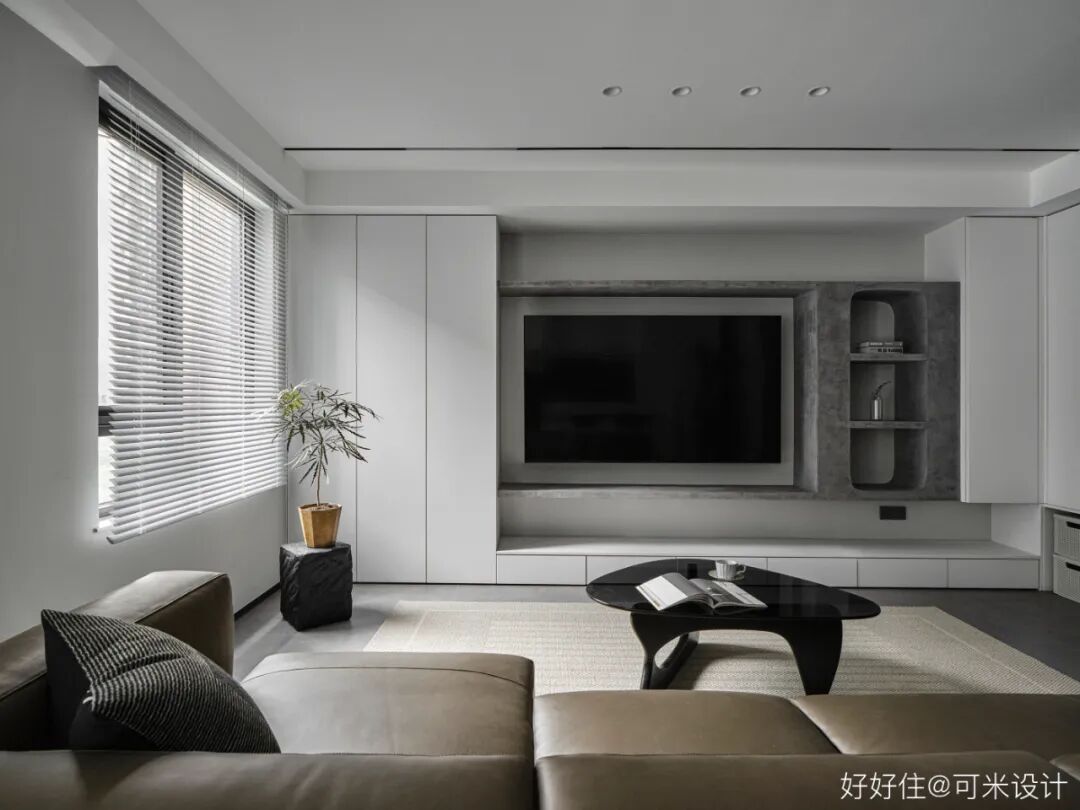 电视背景墙采用隐藏式柜体+展示+电视的组合搭配,可以让整面墙看起来更整齐划一,更显品味。在封闭式的柜子内可以存放一些比较散乱的东西,用马来漆涂刷打造的开放格,让整个墙面更具层次感与高级感,圆弧的边角处理也增加了空间的设计美感,在其中摆放装饰品、书籍等,彰显独特的艺术品味。大面积的白色隐形柜体,更加简洁大气,给人一种纯净、舒适的感受;底部电视柜上方做镂空,适当的开放式展示架增添了空间的层次感和轻盈感,带来一种灵活多变的空间效果。