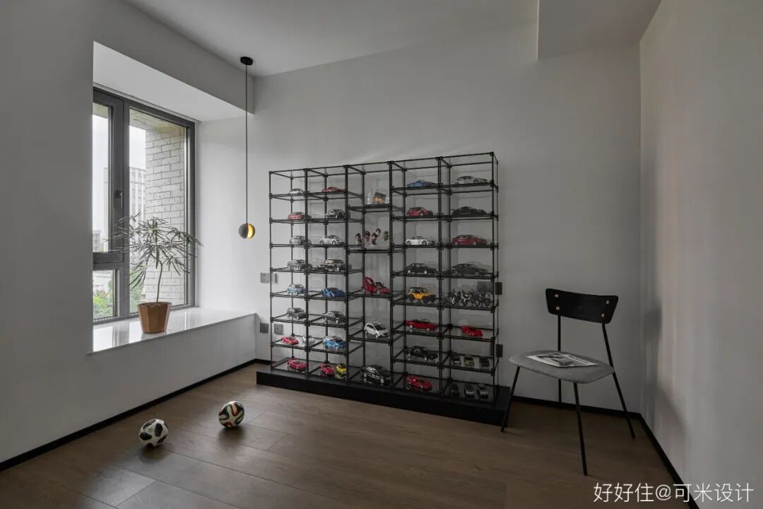 二层朝北的次卧作为活动室,男业主喜爱收藏车模,购置开放式展示架,将各种模型收纳于此。