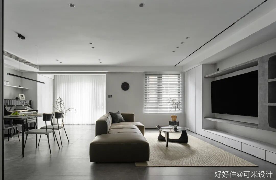 客餐厅一体化的设计,将空间的轴线贯通,开阔式的空间布局纳入更多的自然光线,令空间通透而明亮,减少压抑感和拥挤感。空间上以现代简约为设计手法,灰白色调为主,通过精致悦目的细节,使空间结构明确、外观明快简洁,整体呈现宁静雅致的舒适氛围。中间布置一款棕色的真皮沙发,色调温润柔和,沉静内敛,传承着自然的宽广包容;精致的材质和高度克制的几何设计,拥有三种深度的落座空间,让姿势更自由,释放出慵懒随性的惬意感。