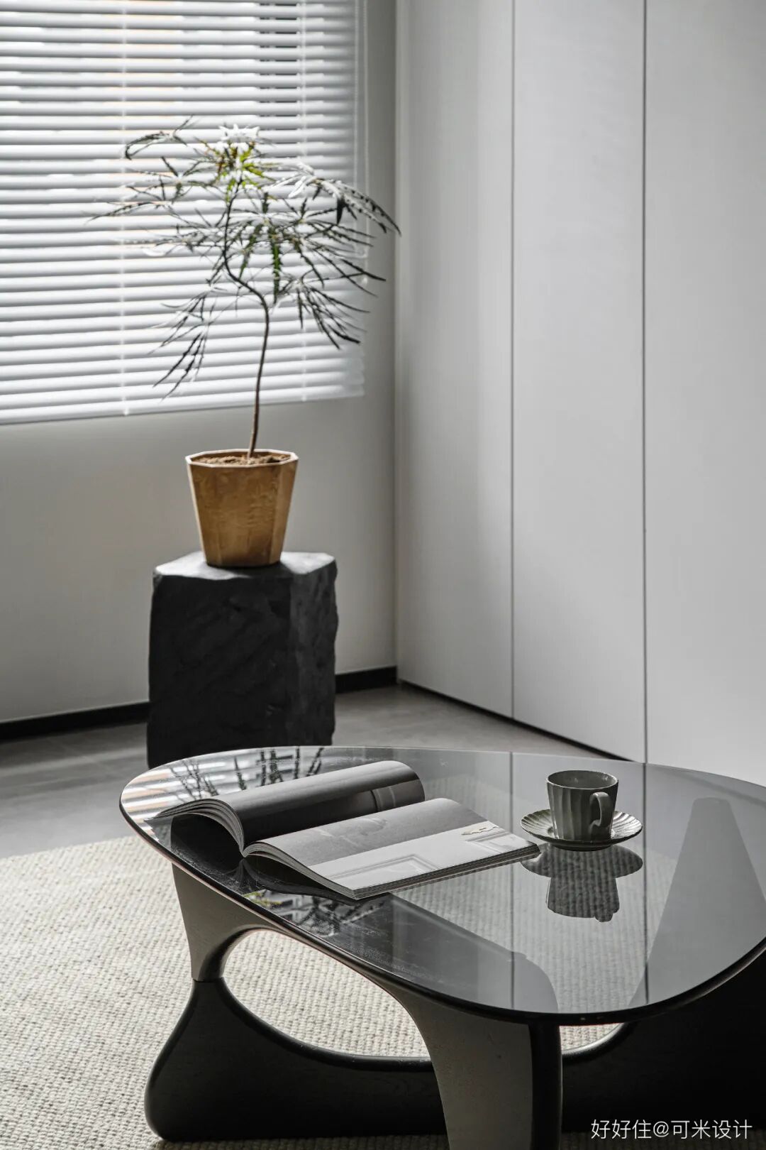 临窗布置一款黑色的树脂坐墩,既可以当坐具使用,又能作为边桌、茶几的替代品,凹凸的外观提升了空间的质感。购置孔雀木的盆栽,一根多叉的造型简单干净,象征健康吉祥。