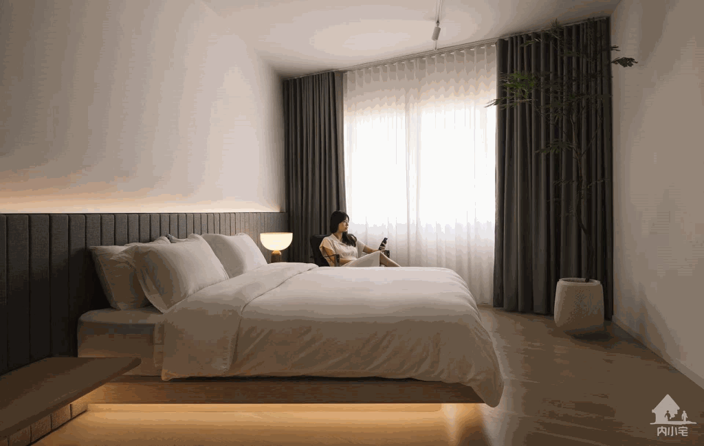 卧室同样充满平和的气息,软垫床头被质感十足的灰色织物包裹着,使房间充满质感与温暖。被隐藏的光源散发着柔和的光亮,十分舒适。