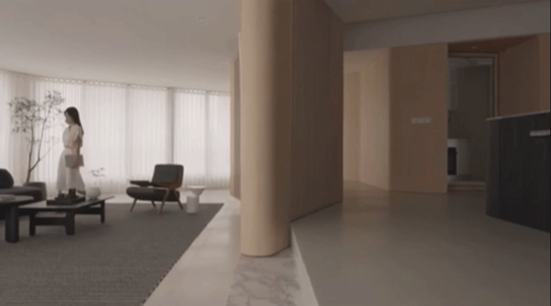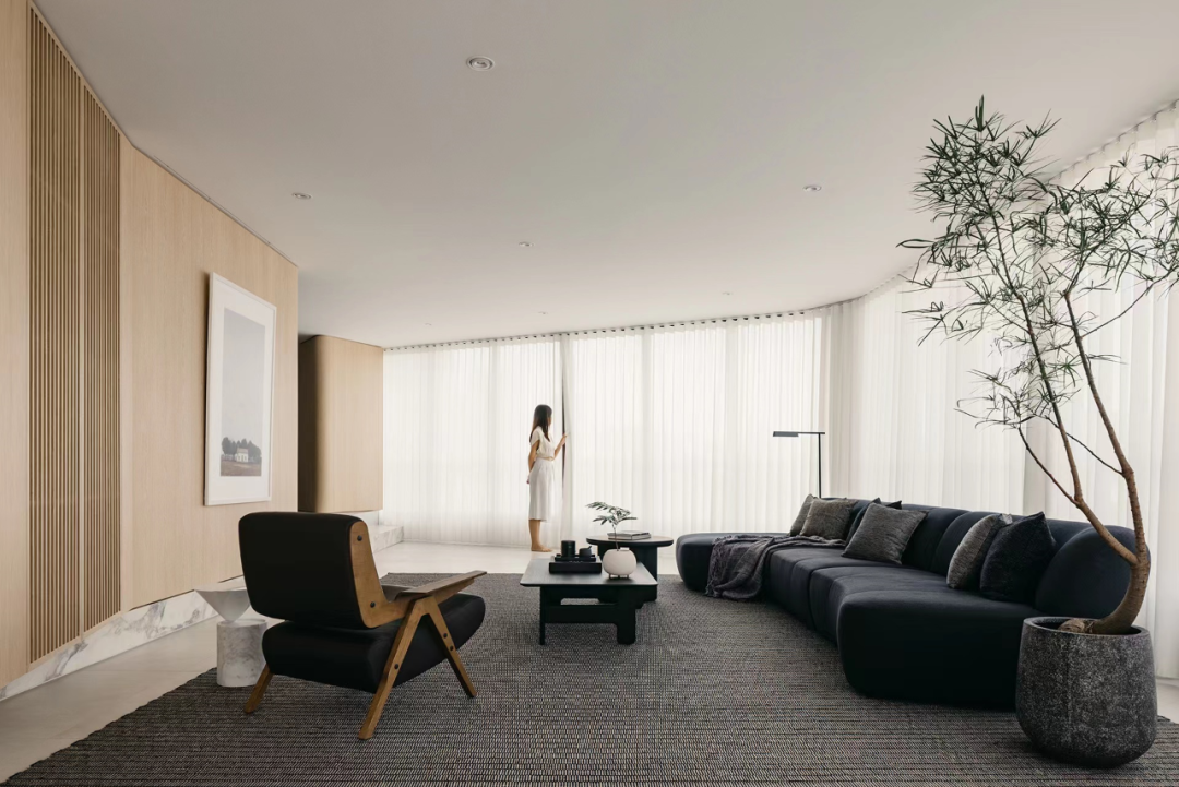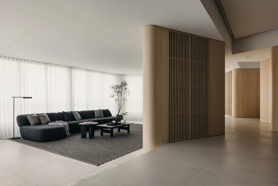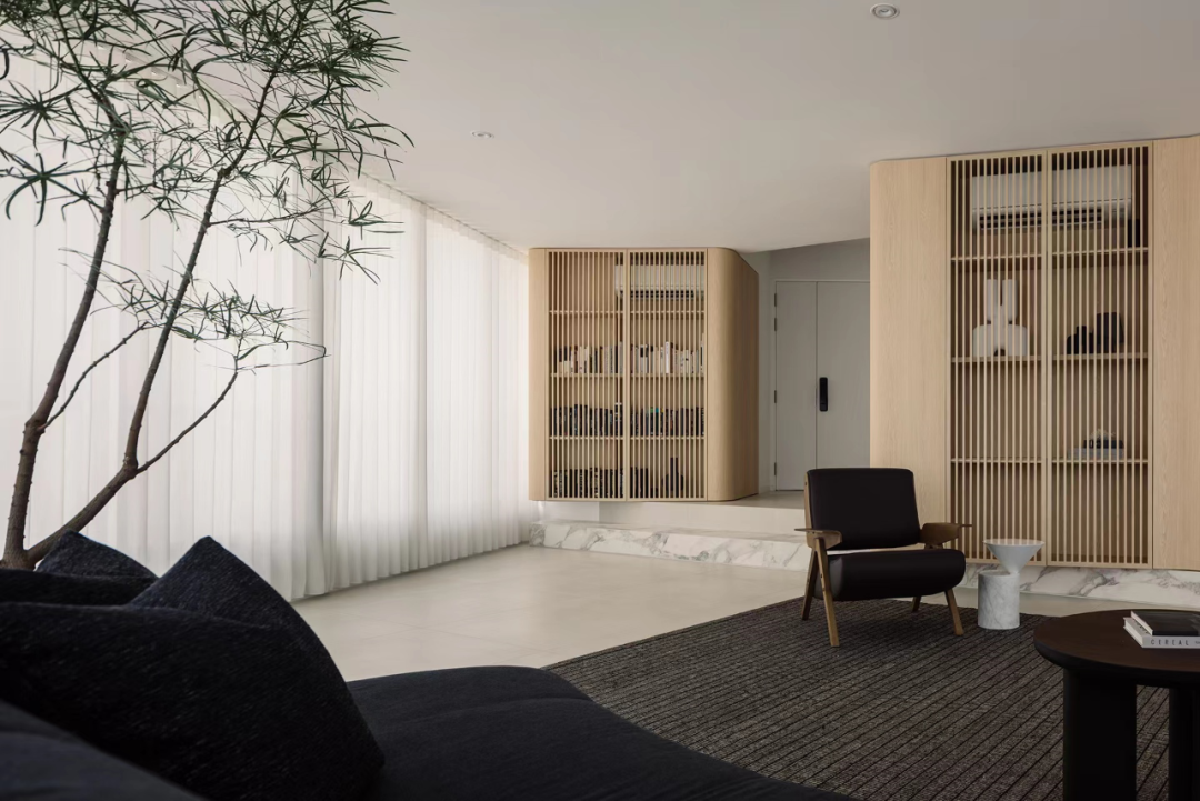 通过抬高地面区分客厅与其他区域,不同角度的木饰面结构墙体既形成遮挡又使不同功能区有着互通性。