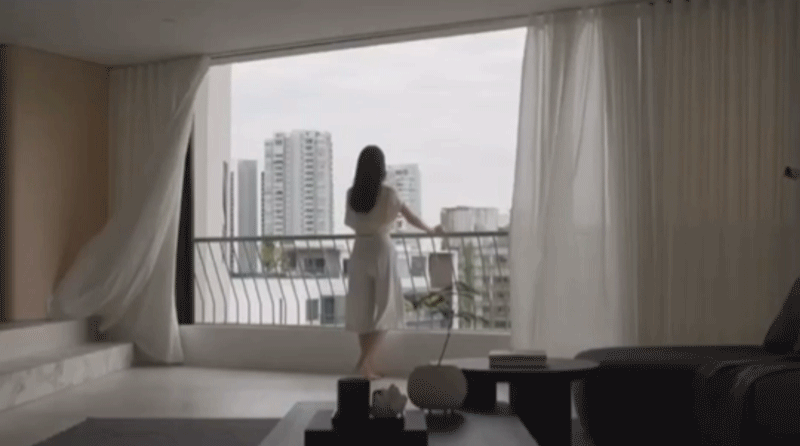 轻柔的纱帘在落地窗前形成美丽的风景,城市景观一览无余。