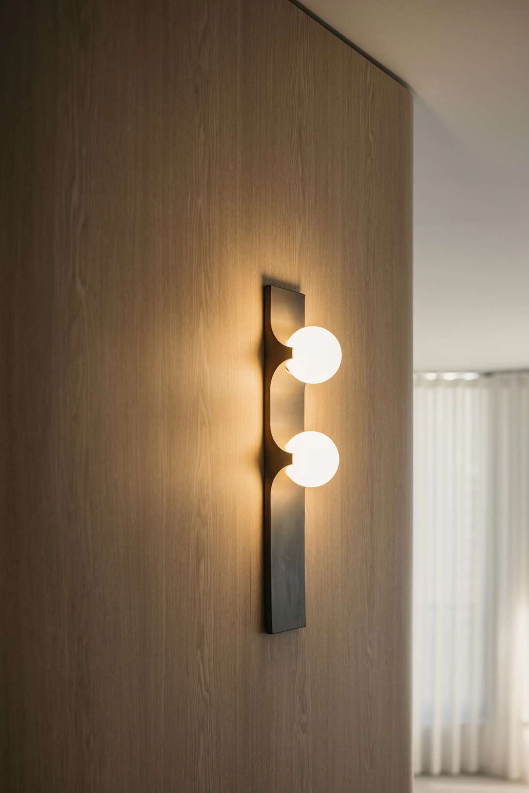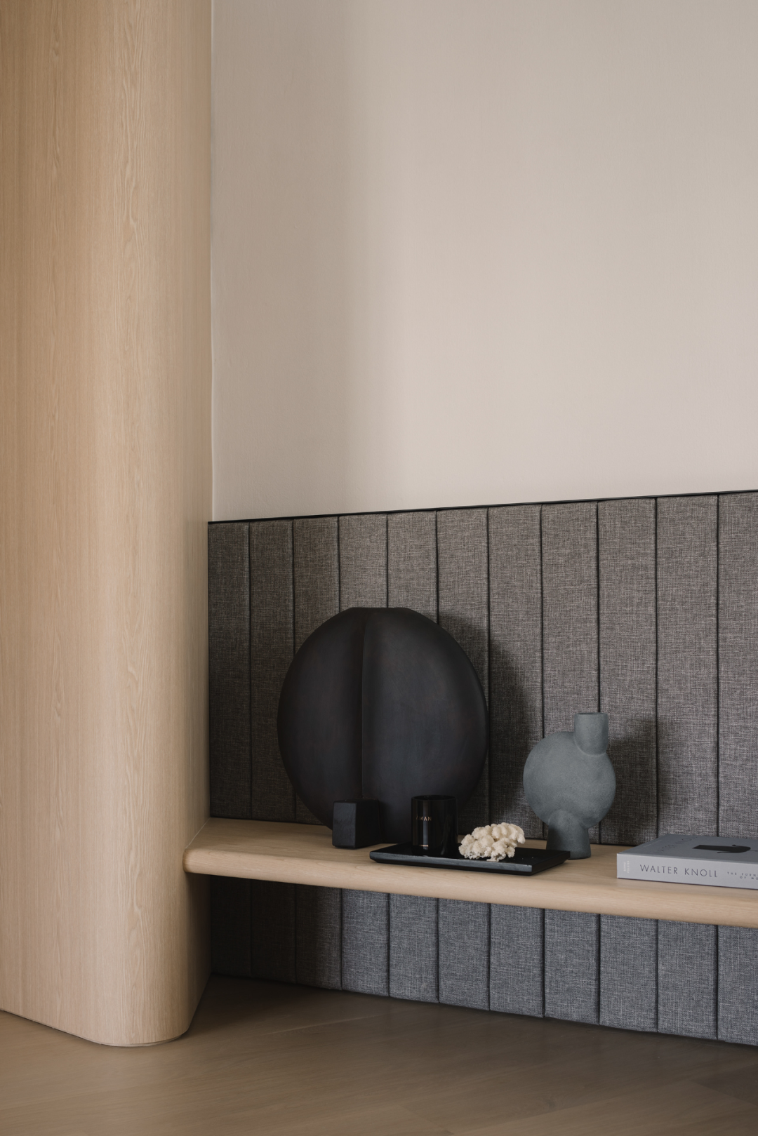 自然的橡木饰面以及圆润的转角,给这个空间带来了一种柔和的方式。温暖的球形壁灯散发着家的温暖。