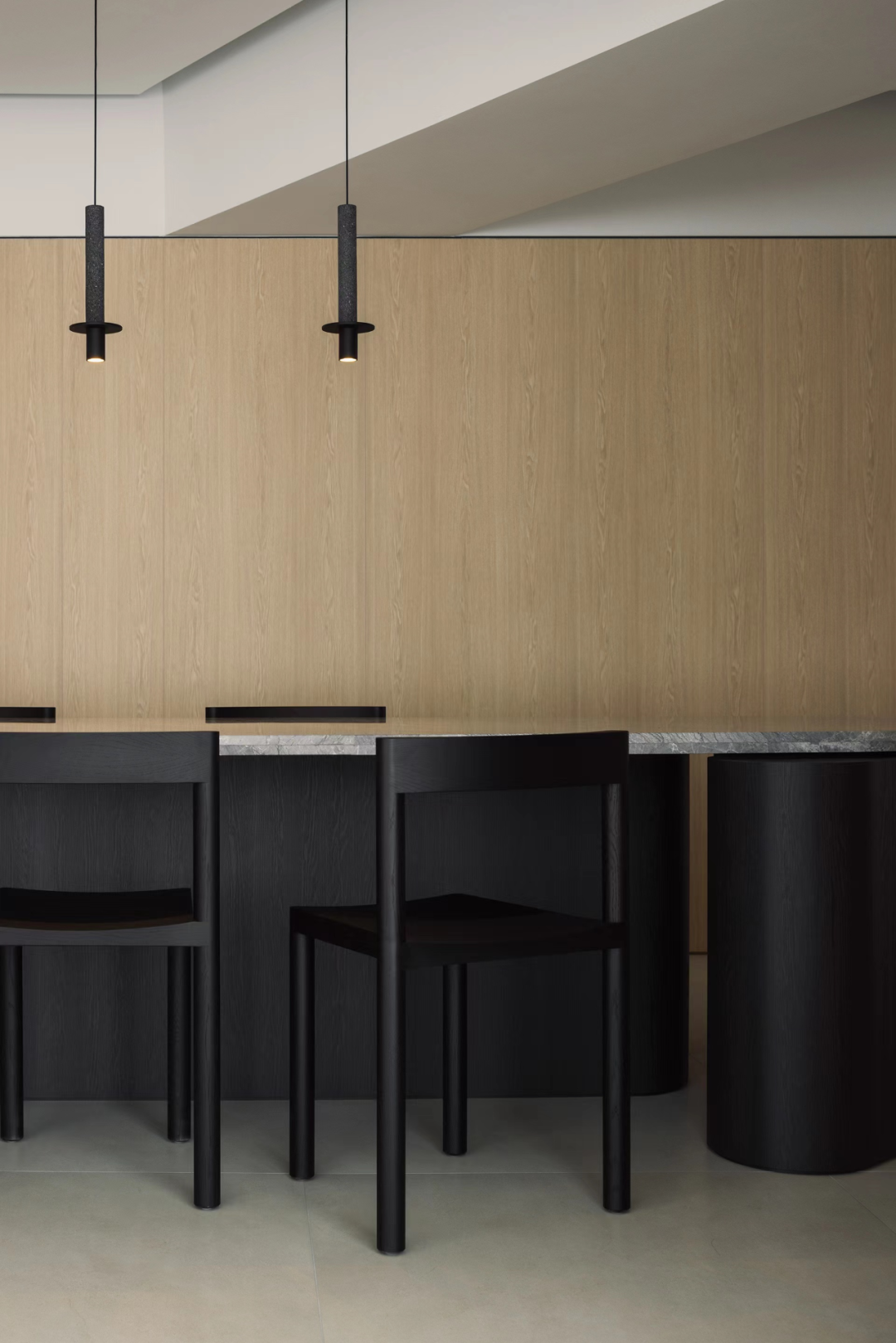 餐厅以黑色为主,在白与木的衬托下,增添了奢华感,角落散发的暖光又为用餐增添了温馨感。