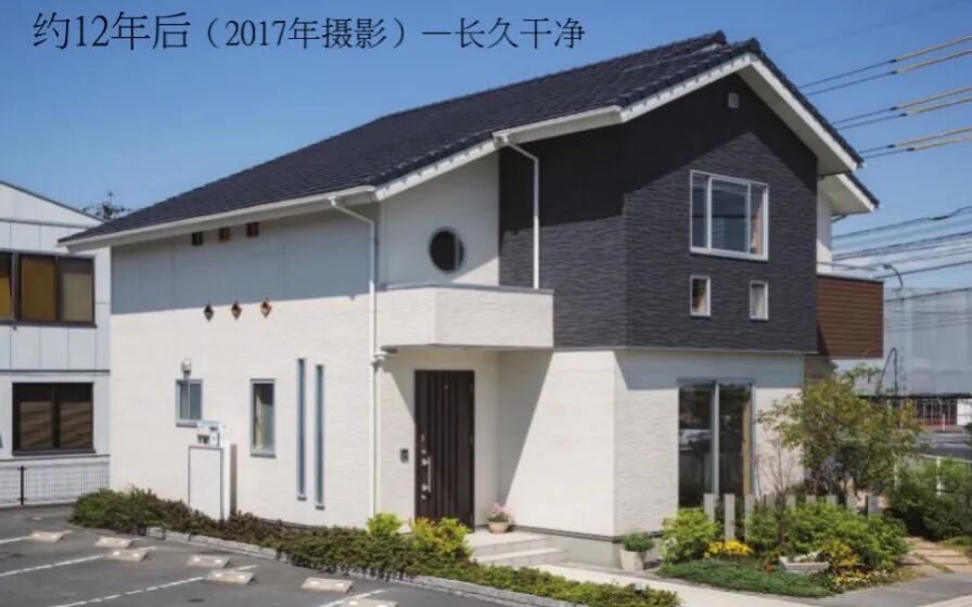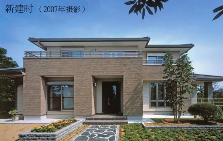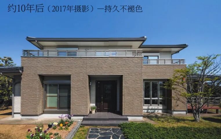 下图为使用一般外壁材的住宅,在十年之后变脏非常明显,表面反碱、生锈现象严重。