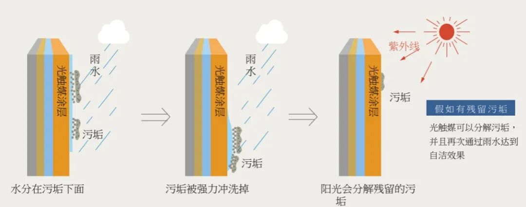 通过阳光(紫外线)分解污垢,达到自洁功效,可以分解外墙表面的油脂类污垢、灰尘、带色液体、霉菌、青苔等污垢,大幅度减弱这些污垢对外墙的沾附力。
