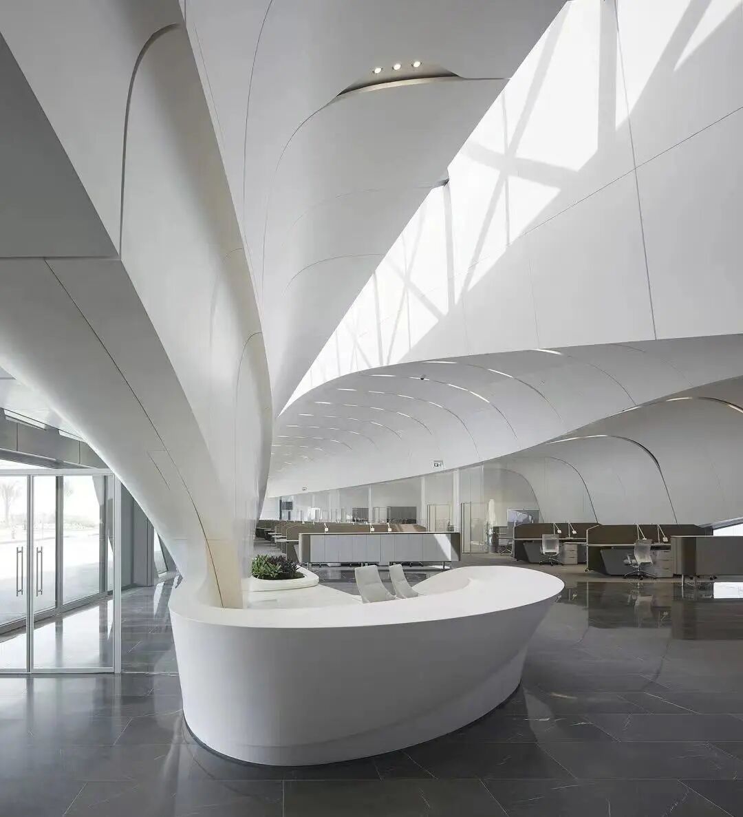 从外至内的白色,将充满想象力的未来感延伸。员工体验同样十分炫酷,室内设有无需接触的通道、虚拟门房、智能会议室以及可以将每日工作自动化的辅助应用程序等,可以满足远程办公、混合办公等不同工作场景。