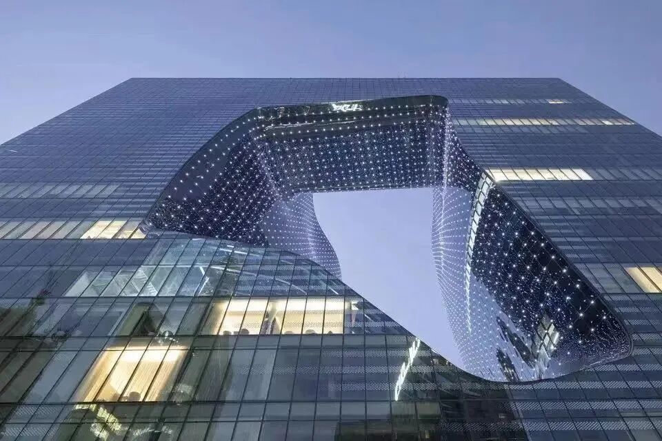 Opus占地84300平方米,由两个独立的塔楼融合而成,立方体中央的“镂空”呈现出自由流动的形态,这是设计中最为别致的部分,镂空部分以外的区域由4300个独立的玻璃单元构成,其中包括平面玻璃、单曲面玻璃和双曲面玻璃。