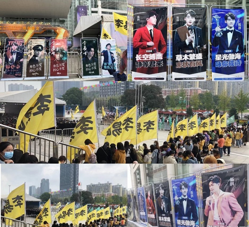 另一方面,粉丝们的聚集往往集中在各种城市公共空间里,并将在该空间长时间的停留等待、拍照、相互分享、进行活动布置安排等。这个过程类似一个集会活动,将在一定程度上实现这群人的公共性话语表达,他们的行为,在某种程度上改变着城市公共空间的使用方式和城市公共空间的公共性本身。在偶像出现之前的长时间等待中,实际上是这场活动的真正意义,粉丝们需要相互熟络、组织安排,相互分享关于偶像的信息和周边用品(海报、荧光棒、灯牌等等),讨论偶像的近期动态,达成对于粉丝身份的相互认同和对于偶像观点的共识。