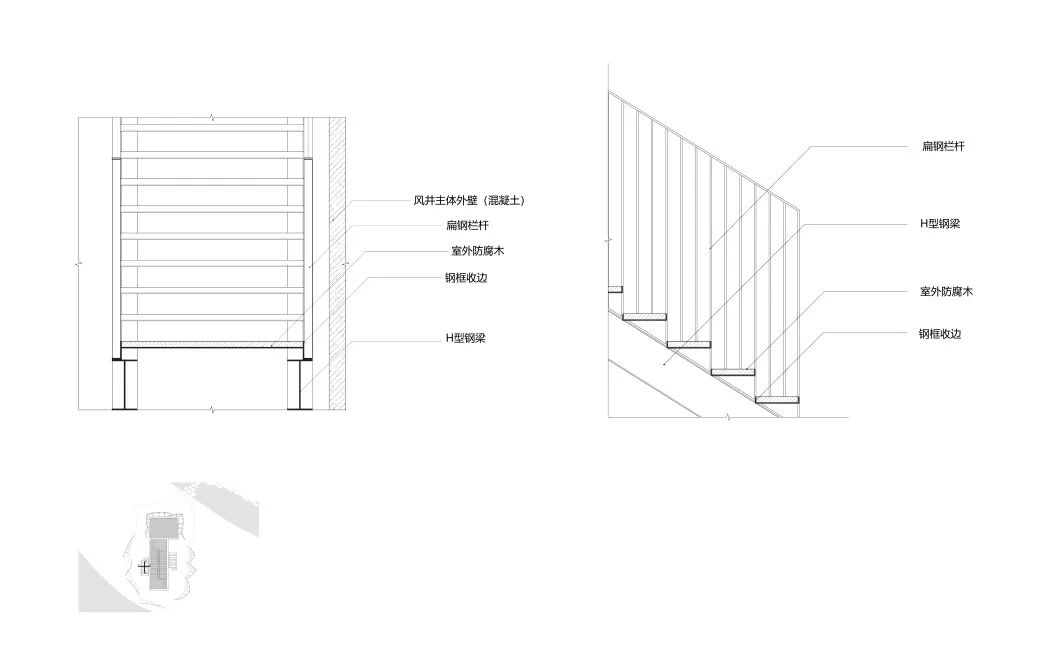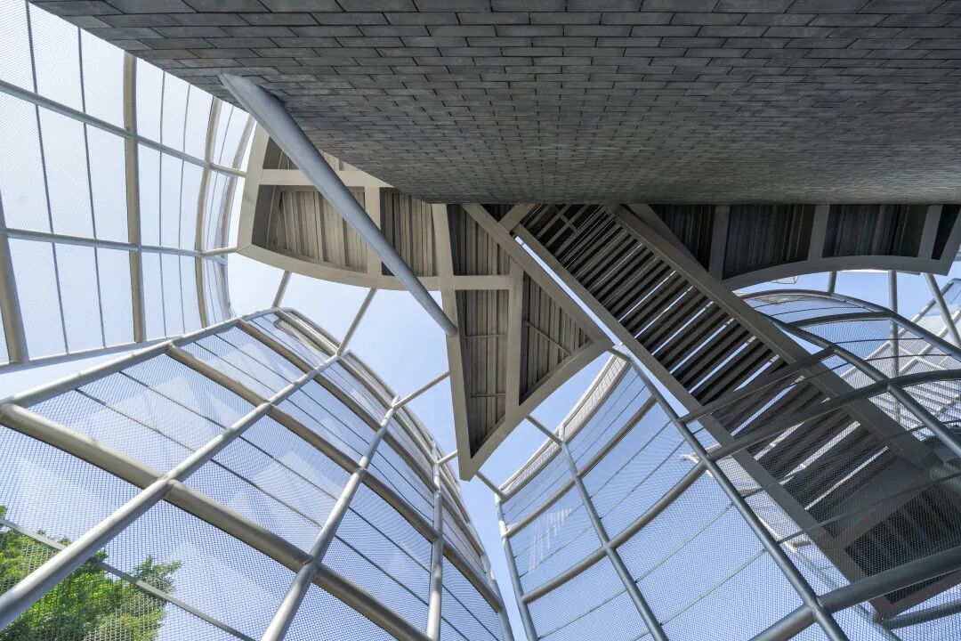 6个中型风井,结合疏散楼梯的功能,我们兼容了可上人体验的路径及平台,空间形态上也各有特点。其他6个小型风井立面上只简单采取景观覆绿和成为公园的避雨亭。在整个设计过程中,虽然地下工程不可避免地有不少意料之外的元素“被告知”,但我们一直努力避免过度设计:既不凸显,也无需遮掩,尽量因势利导,自然统一和谐。