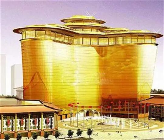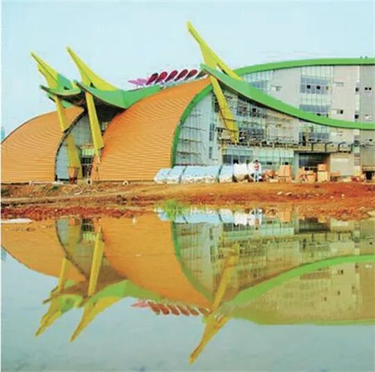 “丑陋建筑”还集中反映出社会转型期多元文化交织常态下,当代中国建筑创作应对全球化与现代化强烈冲击、探索自身传统认知与革新过程中的长久困顿。这个缠绕深远的当代建筑创作共性难题,在大规模快速的空间生产中催生出海量“丑陋”形态,凸显的层次也很丰富。直接套用、滥用传统元素,或者简单直白转译传统符号,形式高于功能,成为许多“丑陋建筑”的共性,也成为普通和明星建筑师都屡屡中招的类型。例如,湖北潜江曹禺大剧院(图11,第九届),在设计上试图借鉴中国传统殿宇式建筑样式,但建筑形体语汇混乱、色彩配置失误;山东潍坊市民文化艺术中心(图12,第一届),建筑创作立意选自潍坊风筝这一民俗文化特色,但建筑形式纠缠于艳丽纷杂的色彩、细部装饰的浓重,反倒因陷入“特色盲动”而失去建筑文化品格。即使是著名建筑师操刀的作品,也因对传统文化理解偏颇与转译生硬,哗然走样。如李祖原设计的北京盘古大观(图13,第一届),作为北京城市中轴线区域的地标之一,将传统文化中传承的龙图腾文化意象附着在现代建筑上,其腾空而起的“龙头”形成了与附近“鸟巢”“水立方”等城市形象极不融合的出位外观,加之内部改建的使用功能问题,该标志性“龙头”已于2021年被拆除。又如广州融创大剧院(图14,第十一届),由英国建筑事务所SCA设计,其灵感源于中国古代丝绸,以中国红为主色调,并选用中国著名画家张鸿飞的《百鸟图》作为建筑表皮元素,但最后呈现出的竟是令人啼笑皆非的“中国棉被”的滑稽效果。