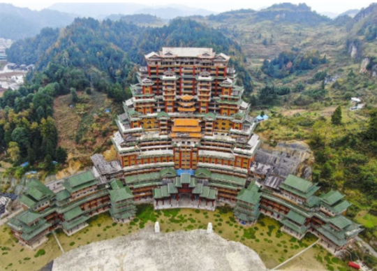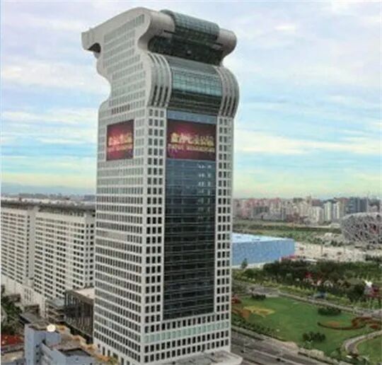 “丑陋建筑”突出让人诟病的即为各种与当下社会文化心理空间极其不适配的杂糅审美与认知趋向。传统小生产者文化符号的空间化直译,成为最具时空反差特质的“丑陋建筑”类型。如位于亚奥核心区域的北京金泉时代广场(图7,第二届),建筑形态和色彩都与中国传统货币“金元宝”极为相似,通体打造出强烈的“黄金”印象,拜金主义意象鲜明。又如河北燕郊北京天子大酒店(图8,第一届),将中国民间传统的“福禄寿”三星彩塑这一长期见于私宅空间的小型工艺品,简单放大至建筑与城市公共尺度,导致与城市景观面貌极不协调。该项目曾以“最大具象建筑”登上吉尼斯纪录,更是经互联网住民的集中符号赋权,成为Twitter与Facebook上被公众诟病的当代中国建筑负面指代的“强符码”。实际上,以“钱币”“元宝”等显性或隐喻为建筑形态的案例在“丑陋建筑评选”中并非少数,令人不解的是,其中也有近些年才建成的新建筑,可见此病症有多么顽固。究其文化根源,仍是前现代“民以食为天”的小生产者文化沉余在建筑空间上的体现,即“缺乏理性精神与逻辑思维,更注重实用与感性存在”。这也表征出,仍有大量建筑的话语权拥有者跋涉于现代化转型的路途中,“如果执行和运用这些现代制度的人,自身还没有从心理、思想、态度和行为方式上尽力向现代化的转变,失败和畸形发展的悲剧结局是不可避免的”[13] 。