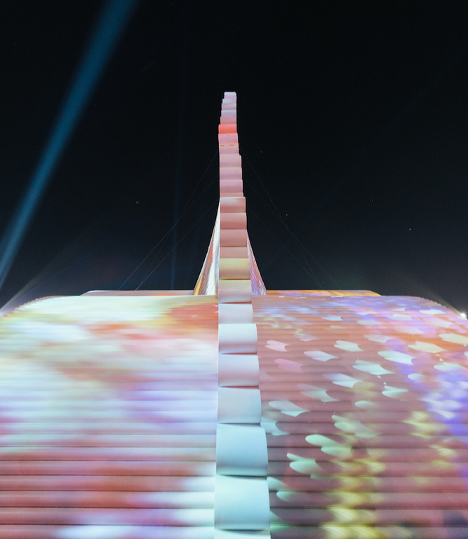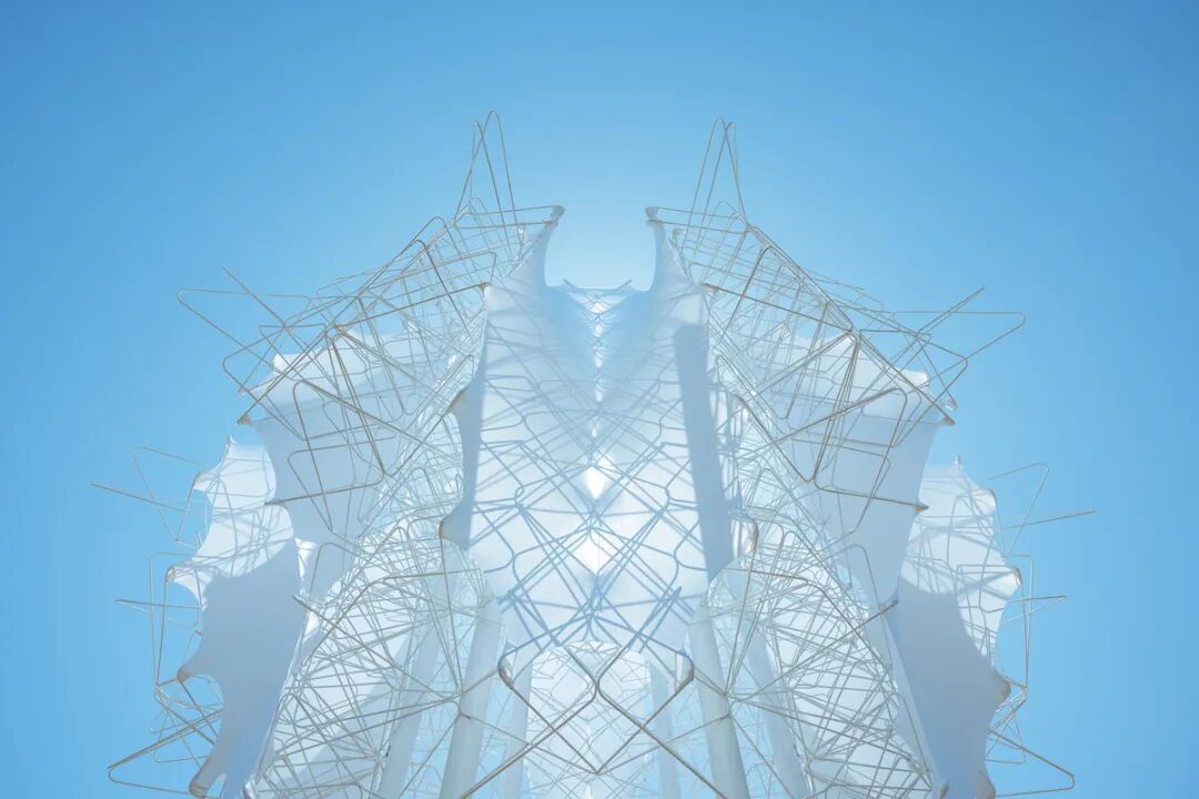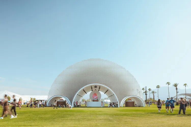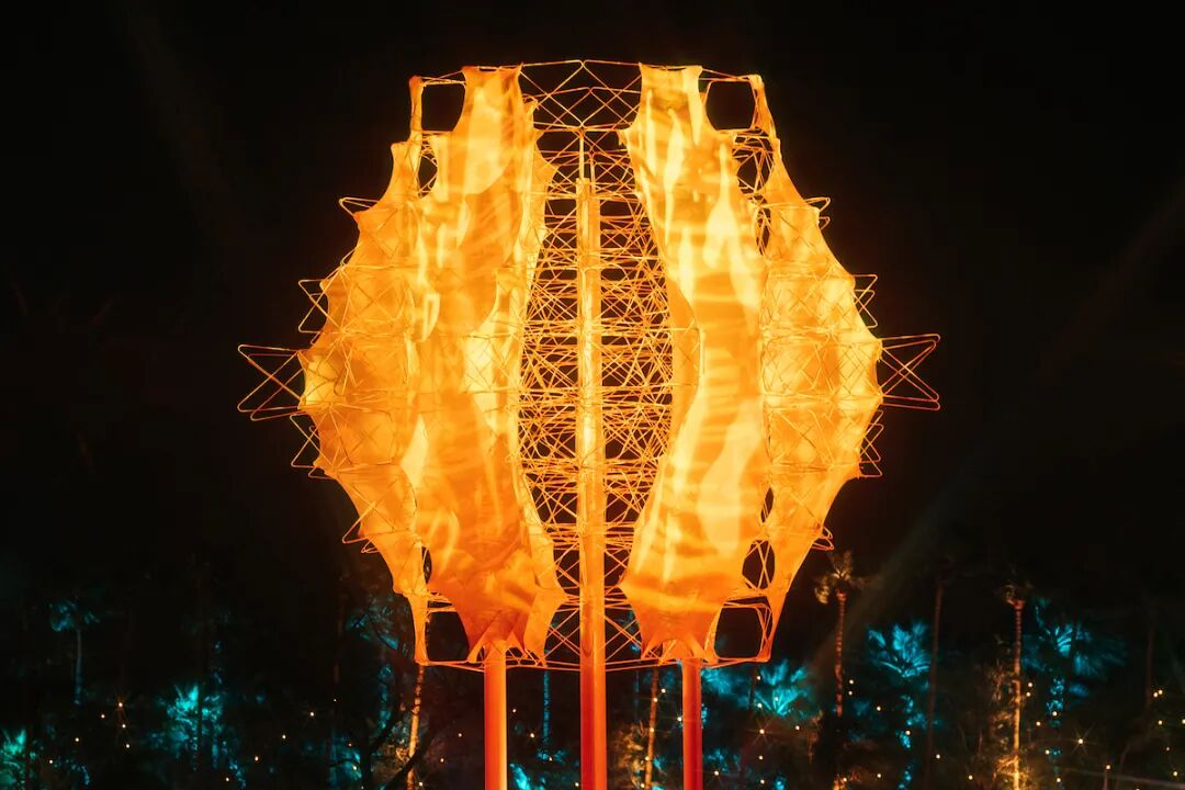 它的结构包括由窗帘类材料制成的柔滑“皮肤”,为参加音乐节的人提供遮荫功能,晚上提供照明。
