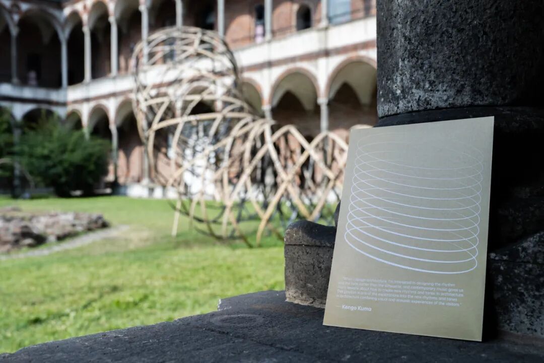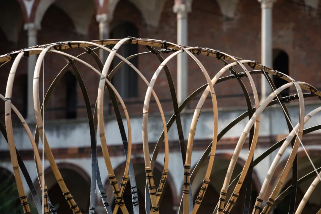 同样在米兰大学庭院中的,还有隈研吾建筑都市设计事务所与智能设备制造商 OPPO 合作设计的能带来多重感官体验的竹装置。