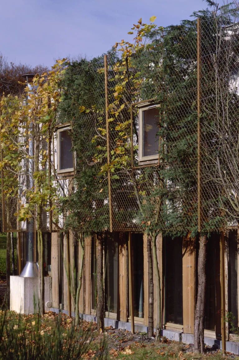 树木沿着房屋周边种植,并修剪成类似墙树 ( 贴合墙壁种植的树 ) 的形式,以掩盖上层不透明的体量,只有窗户透过墙树露了出来。在底层,树干在视觉上模糊了玻璃立面上的垂直构件,并沿着房屋的长轴延展形成绿色的围帐和庭院。