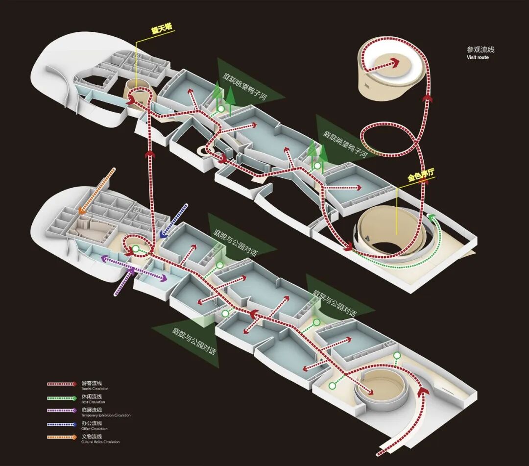 清晰的内外流线,将办公、参观、货流等部分清晰分流,同时重新规划了人车分流的双动线,将主轴线移至北侧,参观者经游客中心,沿主轴依次进入各馆参观游览。