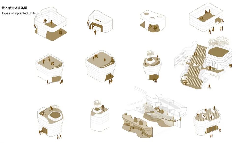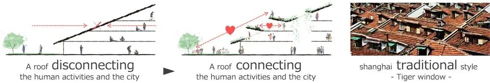 屋顶被解构成了尺度各不相同,却在不同高度上环环相扣的个体,并由次打造出妙趣横生的在三维层面上丰富变化而又紧密相连的室外平台与坡地,并与屋顶下方的建筑功能及其包含的人类活动交相呼应。