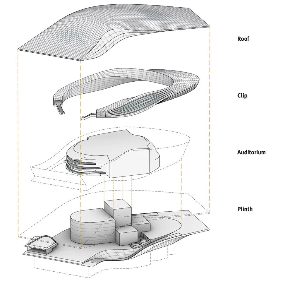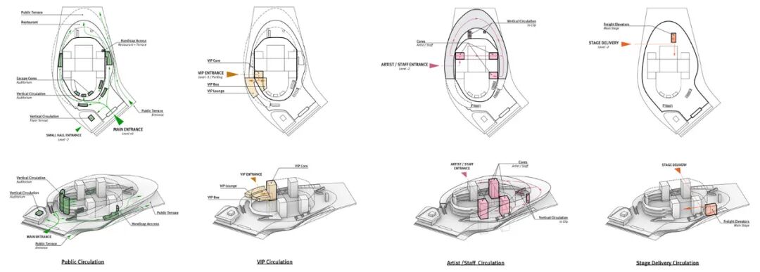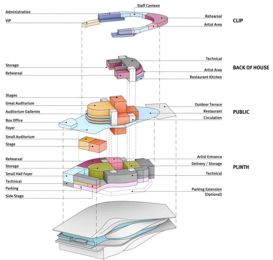 基座的功能涵盖了售票处、会议室、洗手间、与贵宾区相连的停车场、演职员通道、卸货区、储藏室等空间。