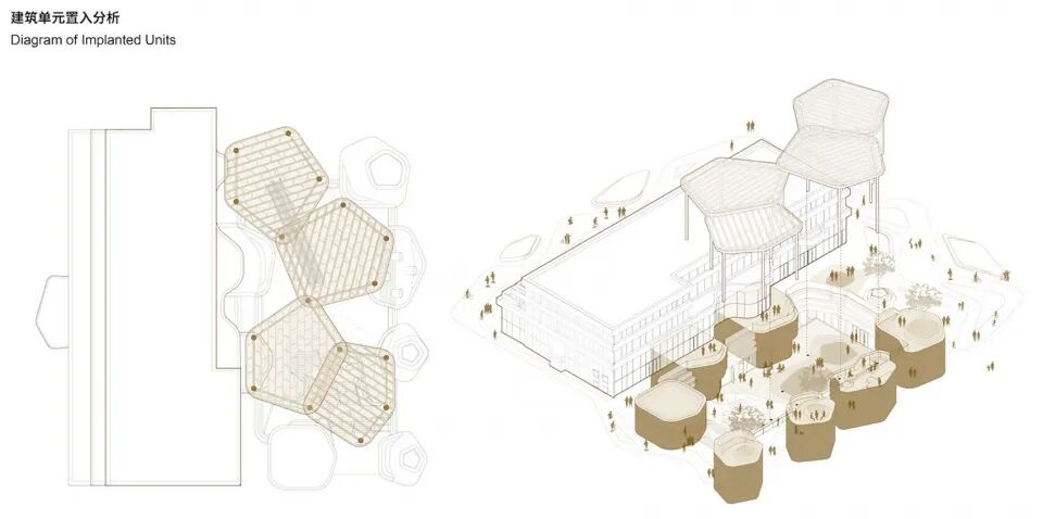马岩松设想园区中心的新建筑将成为大树树冠的延伸;另外通过抬升建筑首层中心空间,为地面创造一片开阔的新城市公共空间。