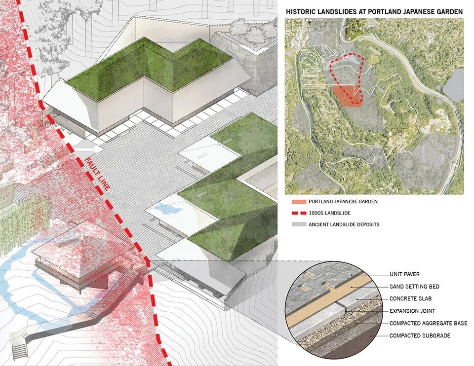 解决地质条件带来的挑战:一部分平台、花园和建筑物被建造在曾经发生过滑坡的地点。混凝土板上铺设了一层沙子,并留出了足够宽的伸缩缝隙,使铺装可以随着地面而弯曲。