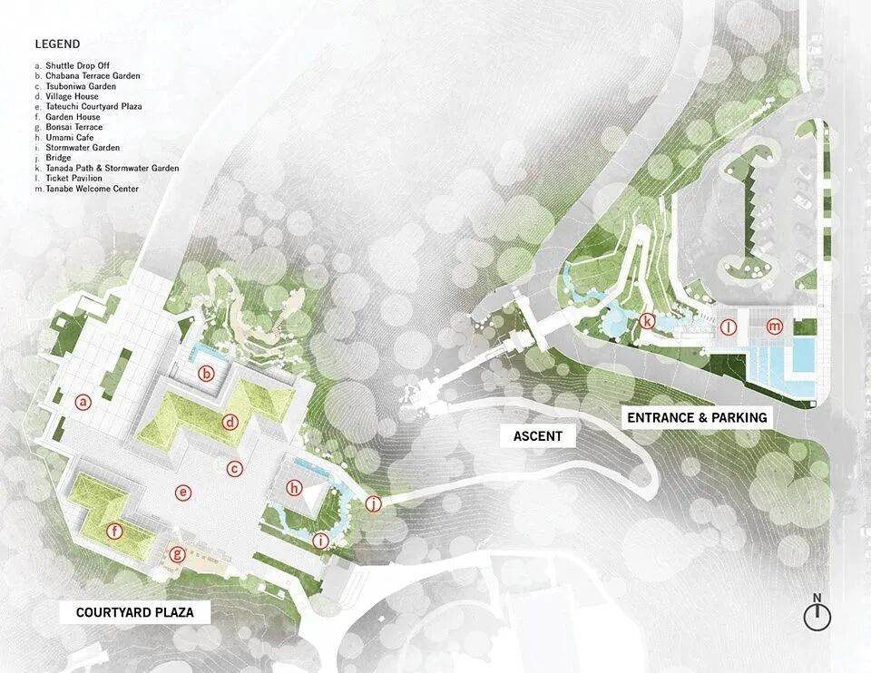 Tanabe雨水花园:在深入路径的过程中,游客会遇见一系列相互联系的可持续设计元素,包括雨水处理景观、种植着本地植物的花园和绿色屋顶等。它们将不同空间连接在一起,同时提醒着他们对于环境的责任。